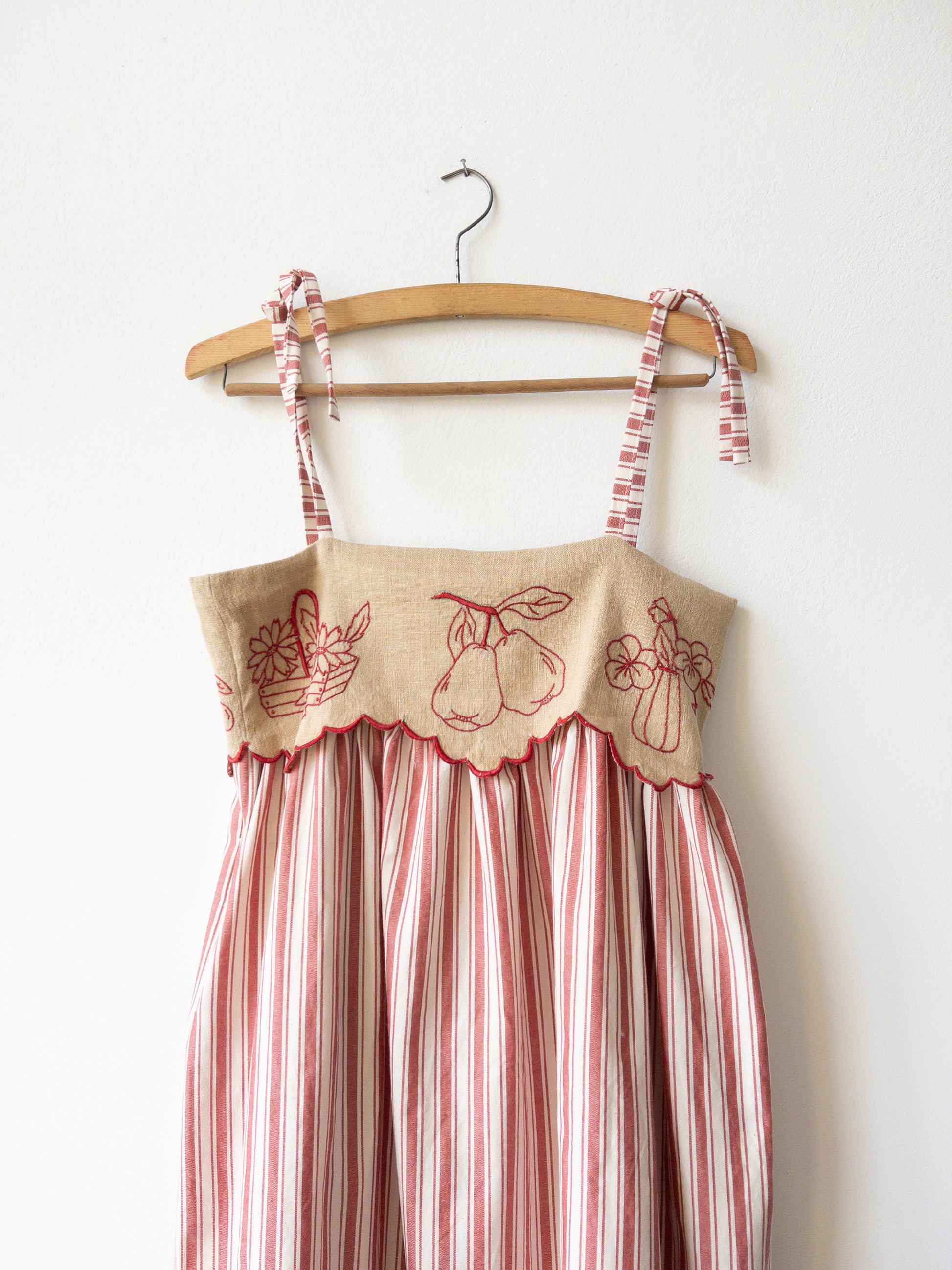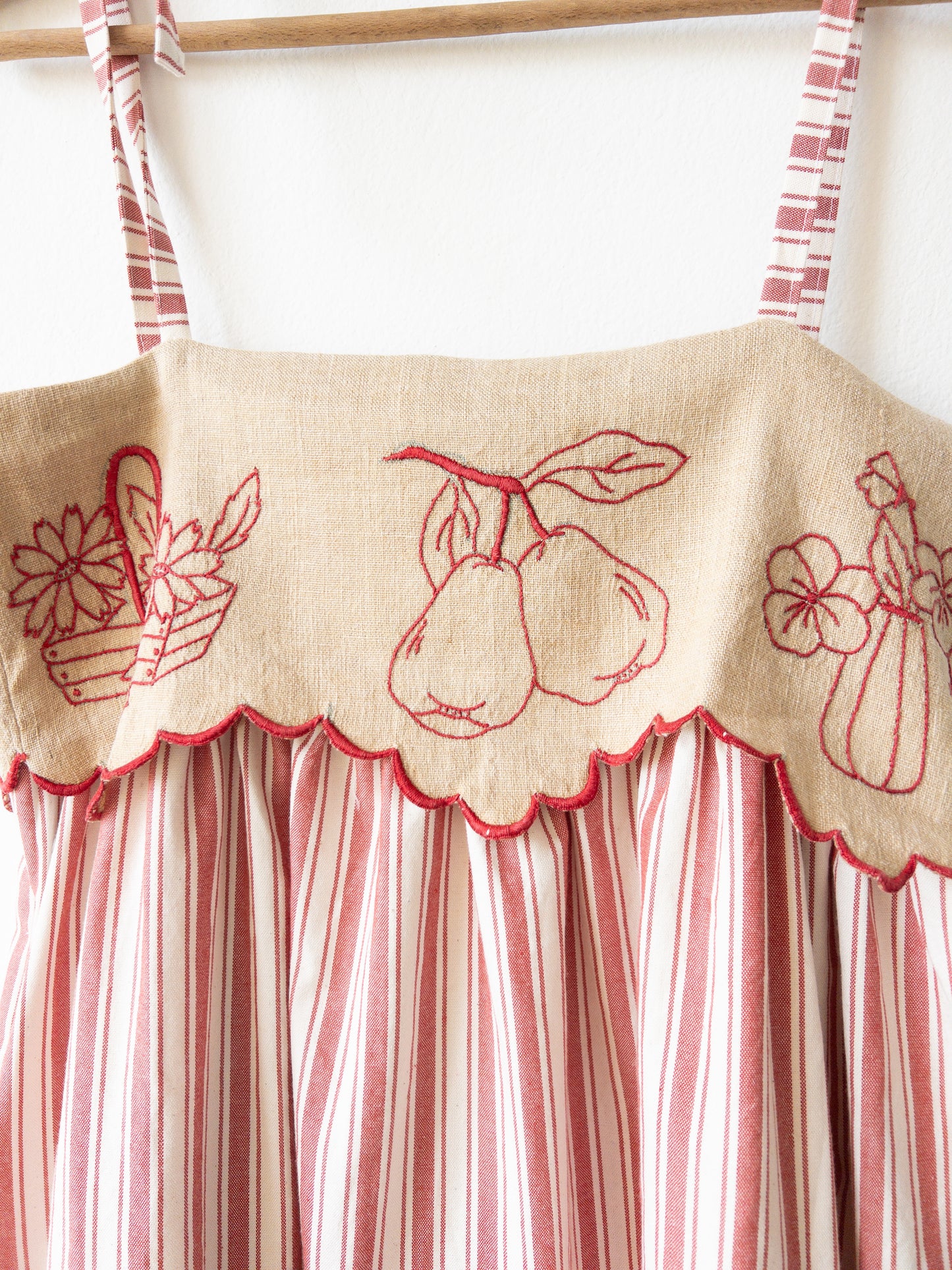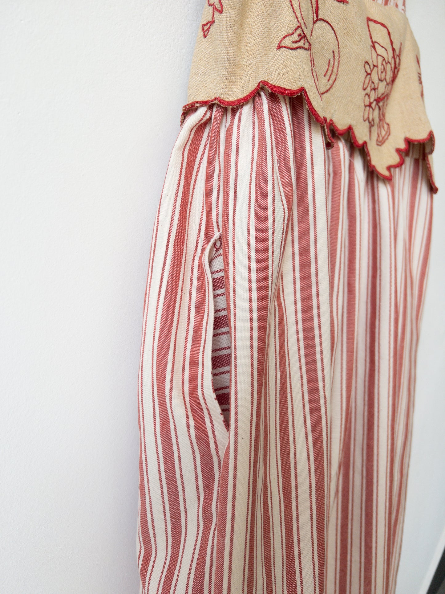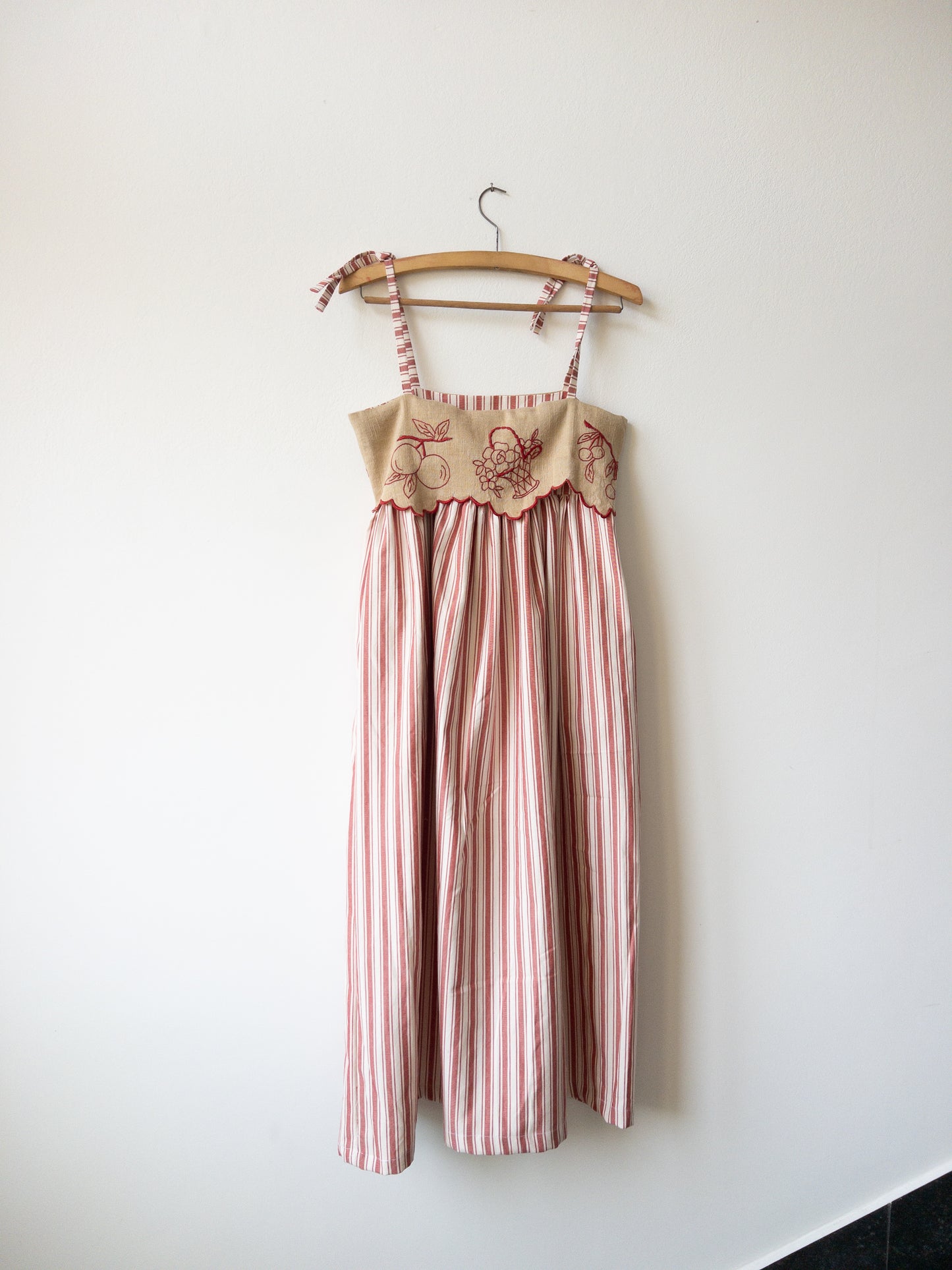Šaty na ramienka ušité z plátna a starej španielskej výšivky, ktorá pôvodne slúžila v kuchyni. Na oboch stranách majú vrecká.