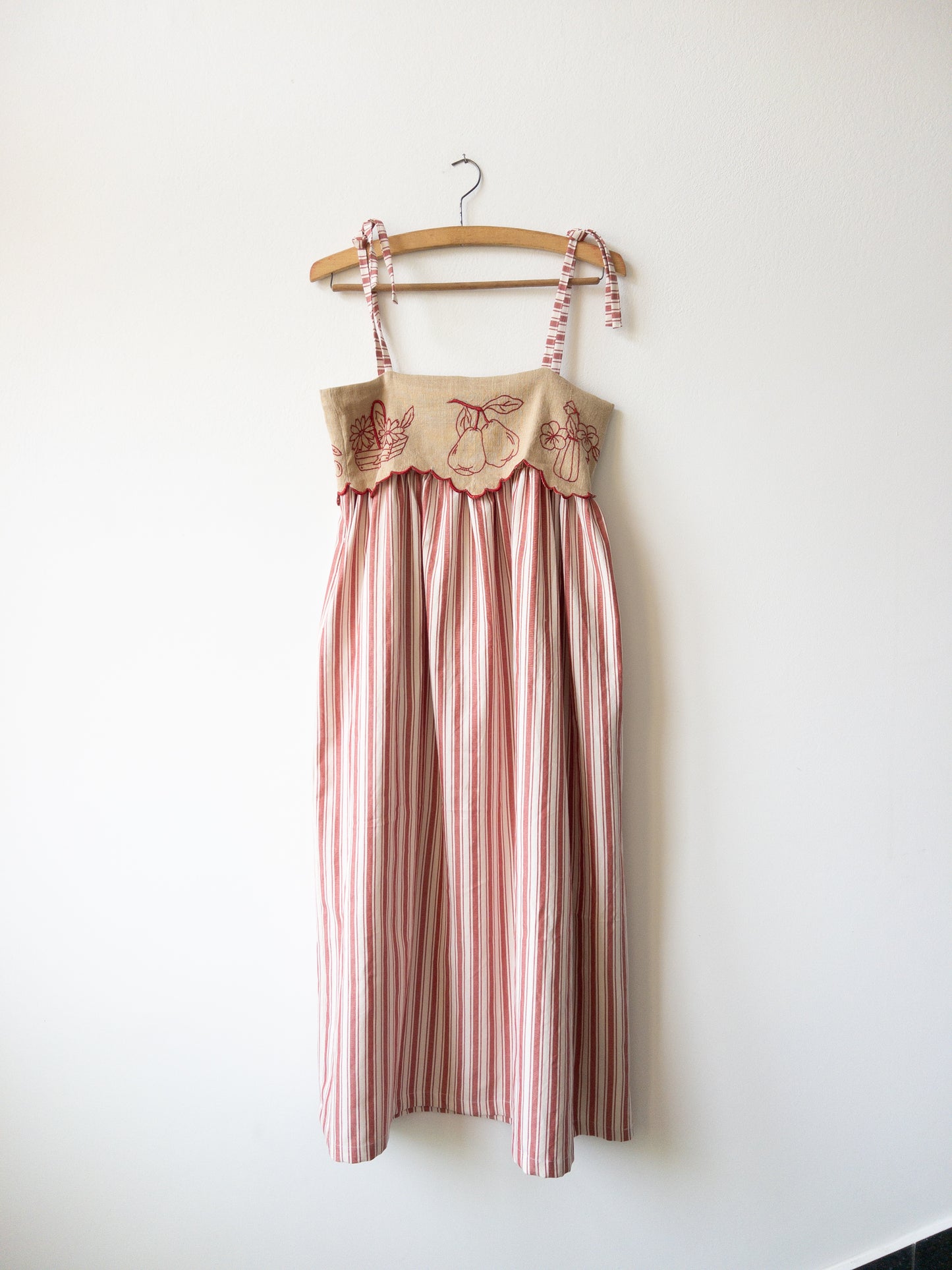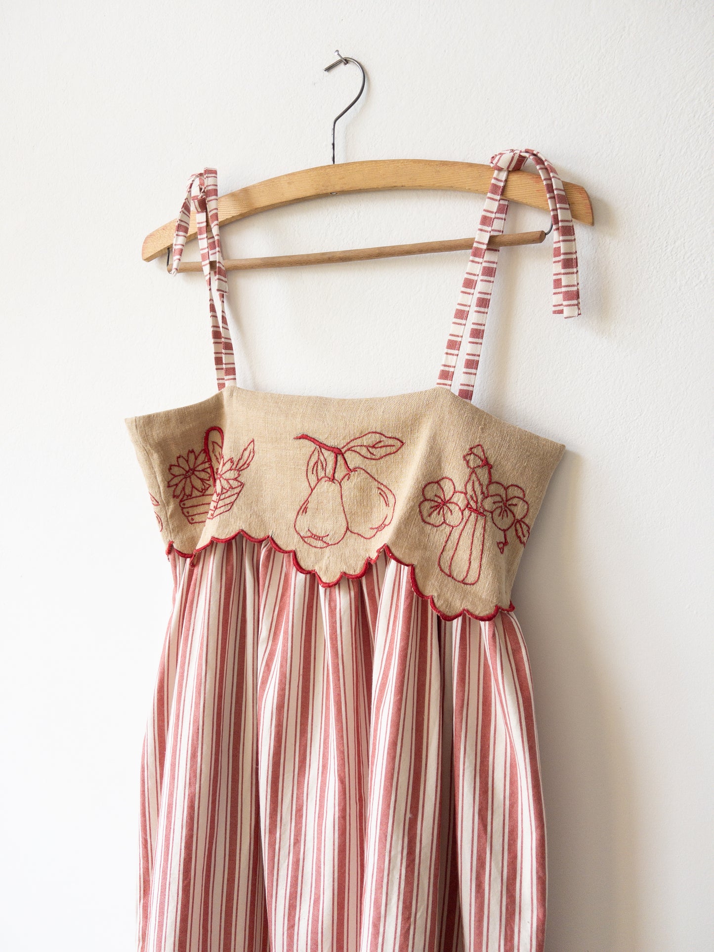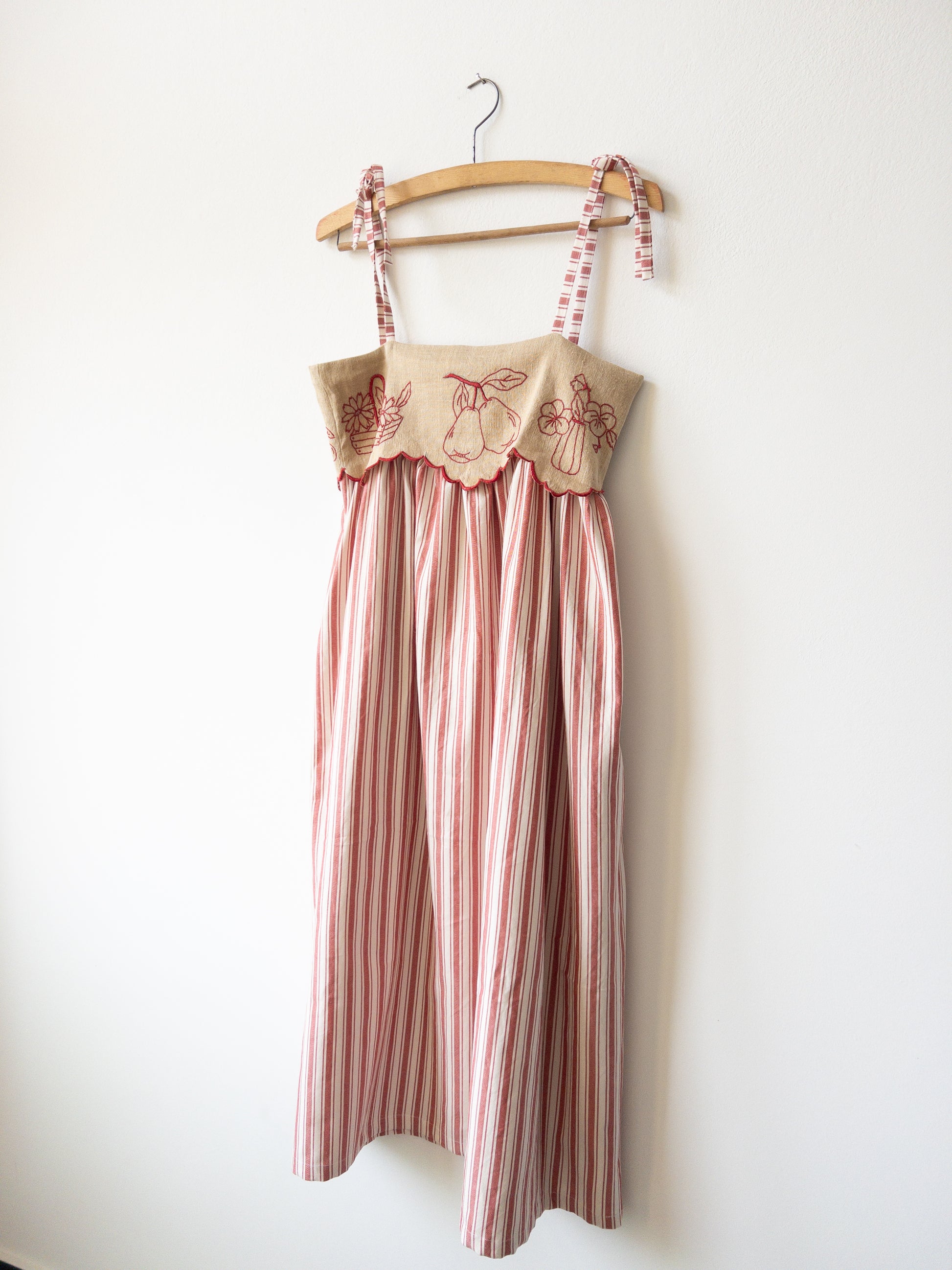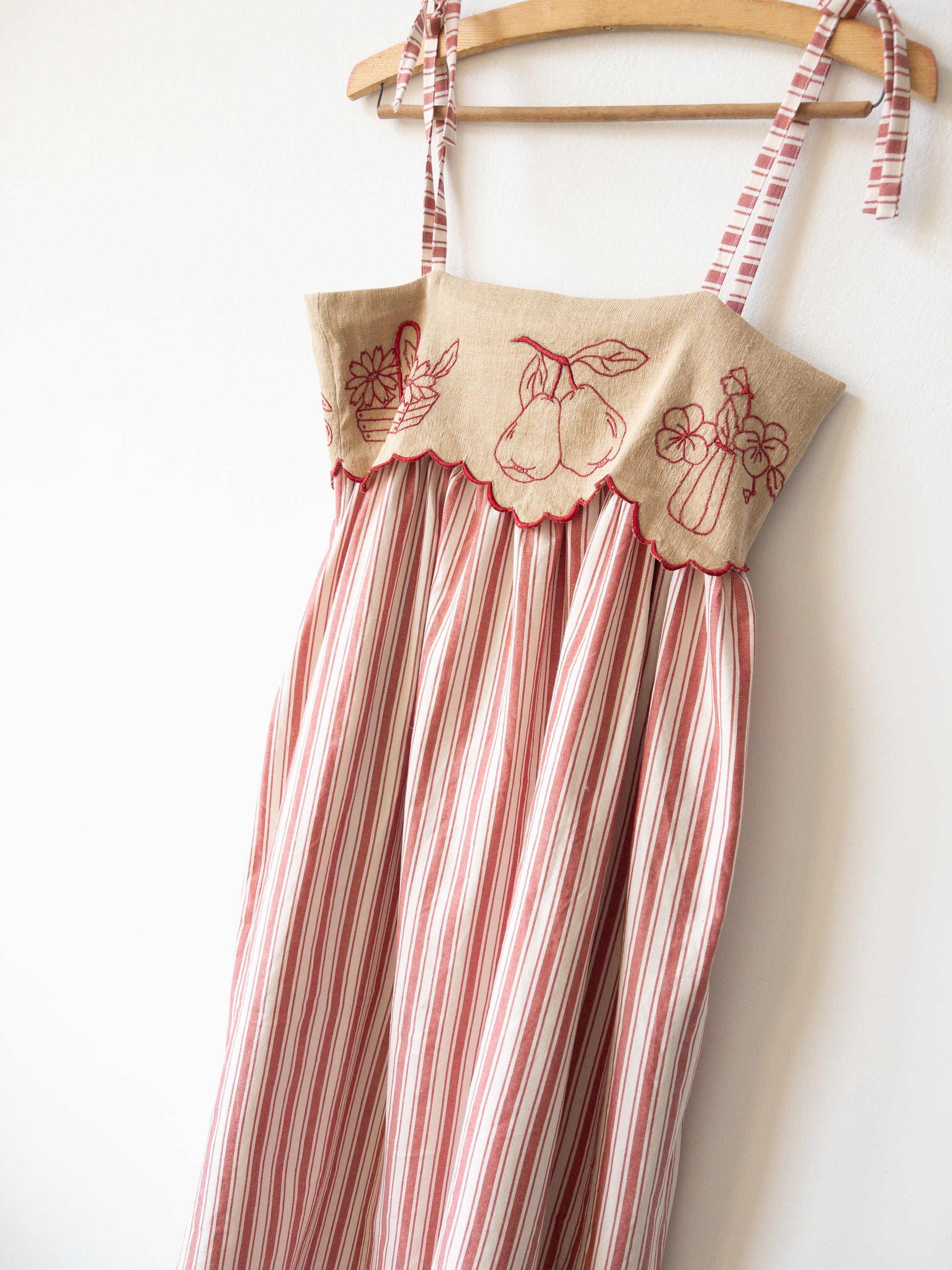 Šaty na ramienka ušité z plátna a starej španielskej výšivky, ktorá pôvodne slúžila v kuchyni. Na oboch stranách majú vrecká.