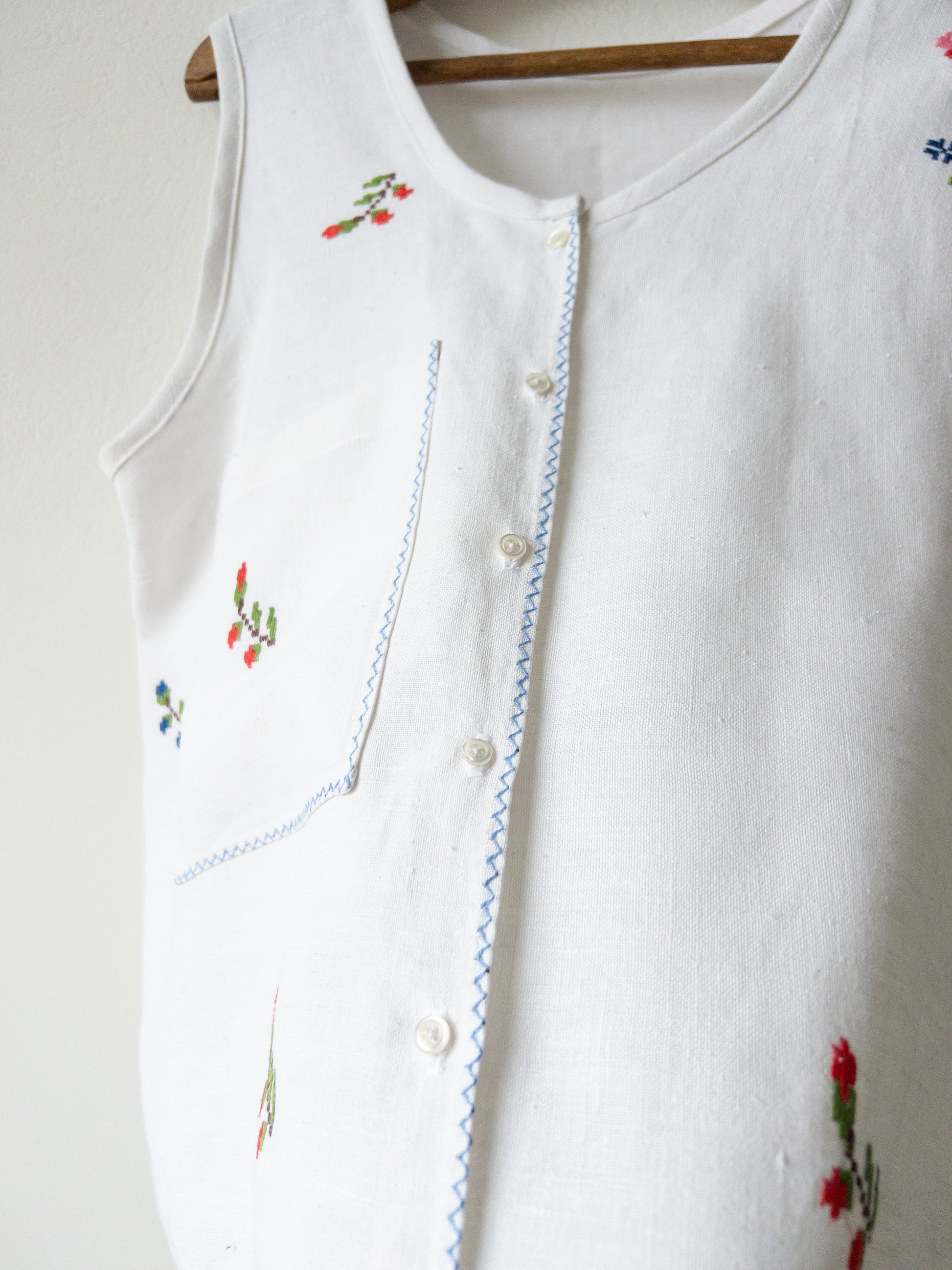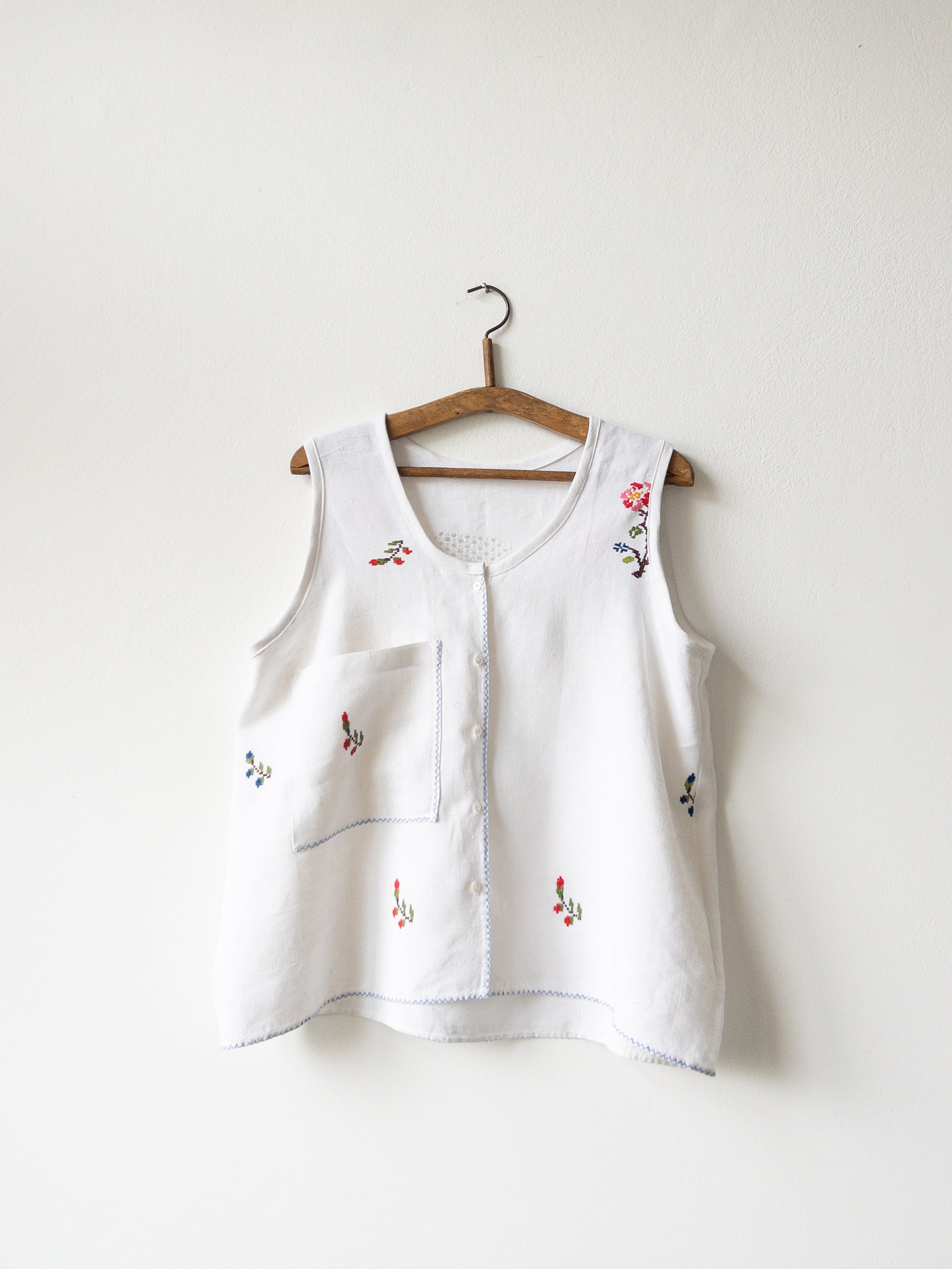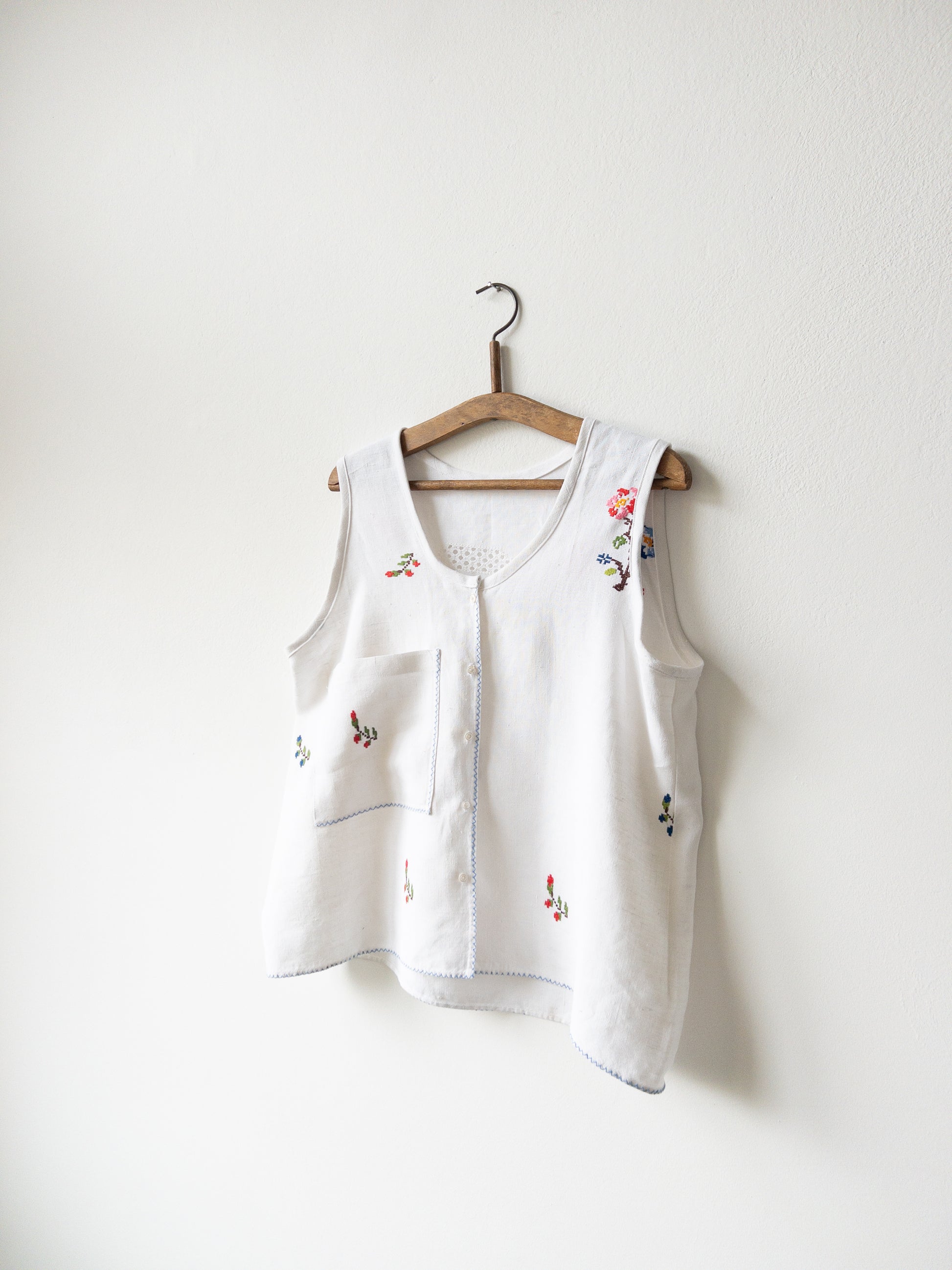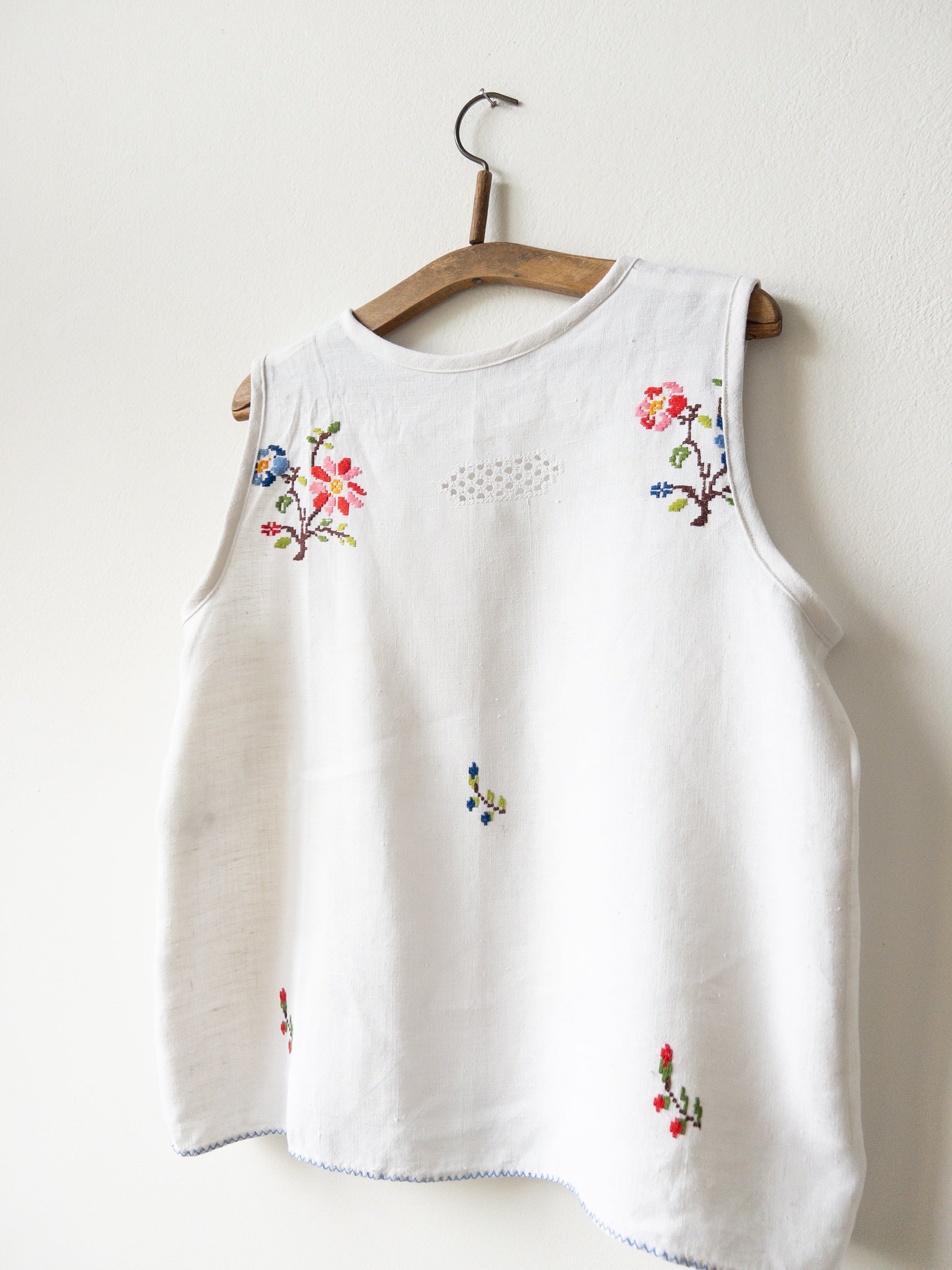 Košeľa bez rukávov ušitá zo starého vyšívaéhnéo obrusu. Vnútro aj vonkajšie lemy sú olemované šikmým prúžkom a celá košeľa je doplnená starými perleťovými gombíkmi.