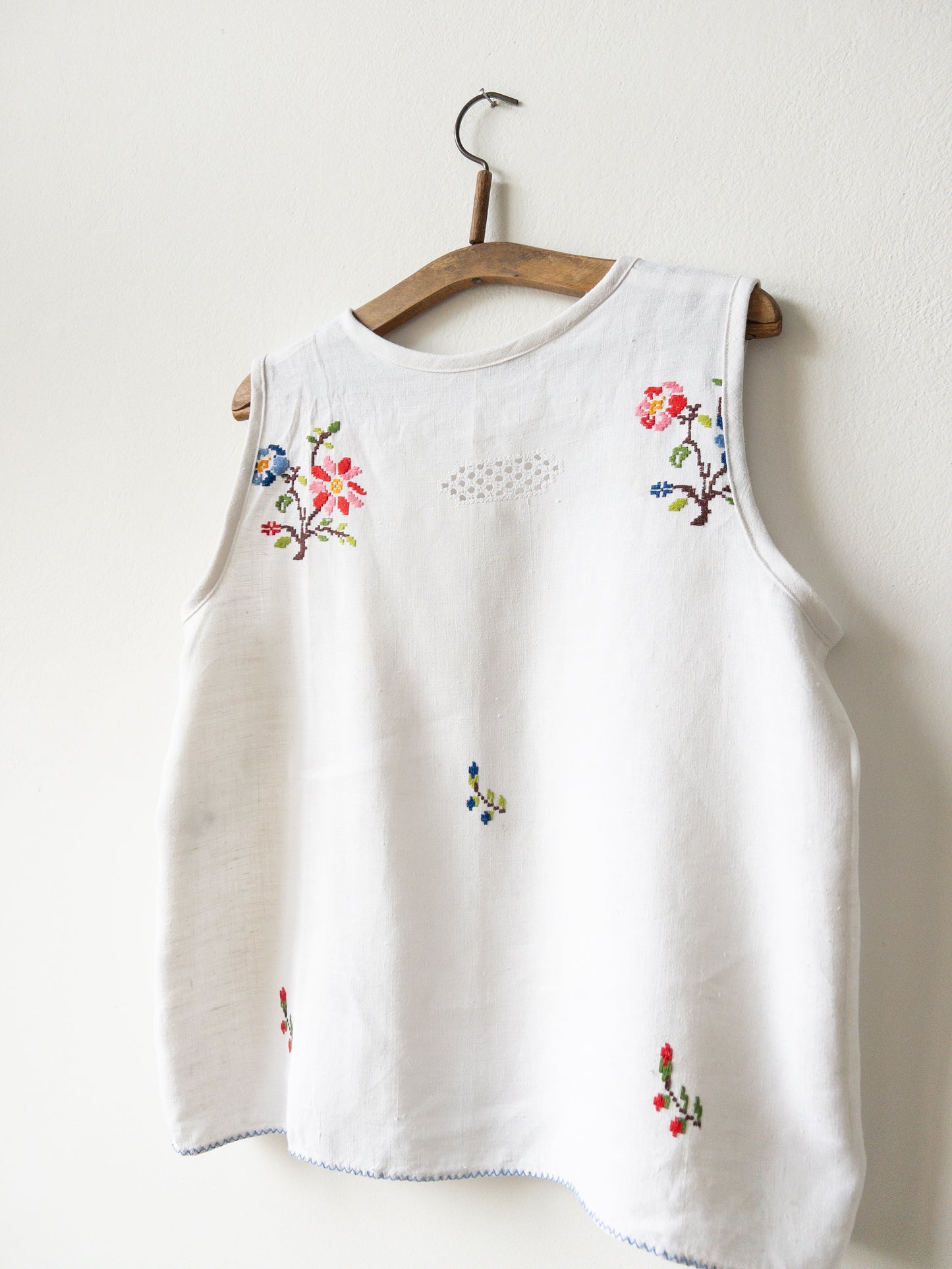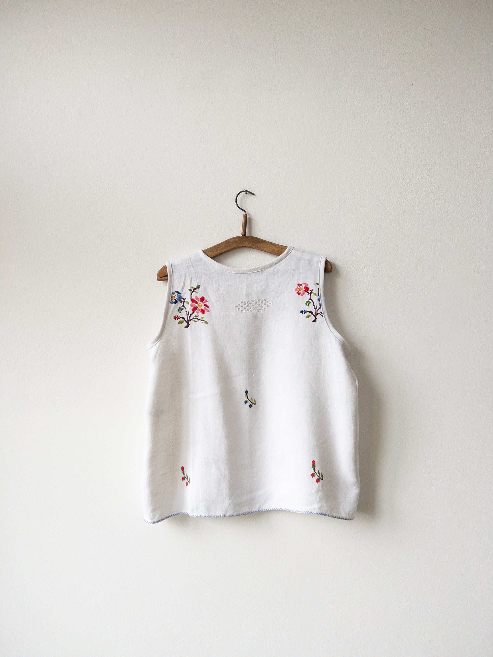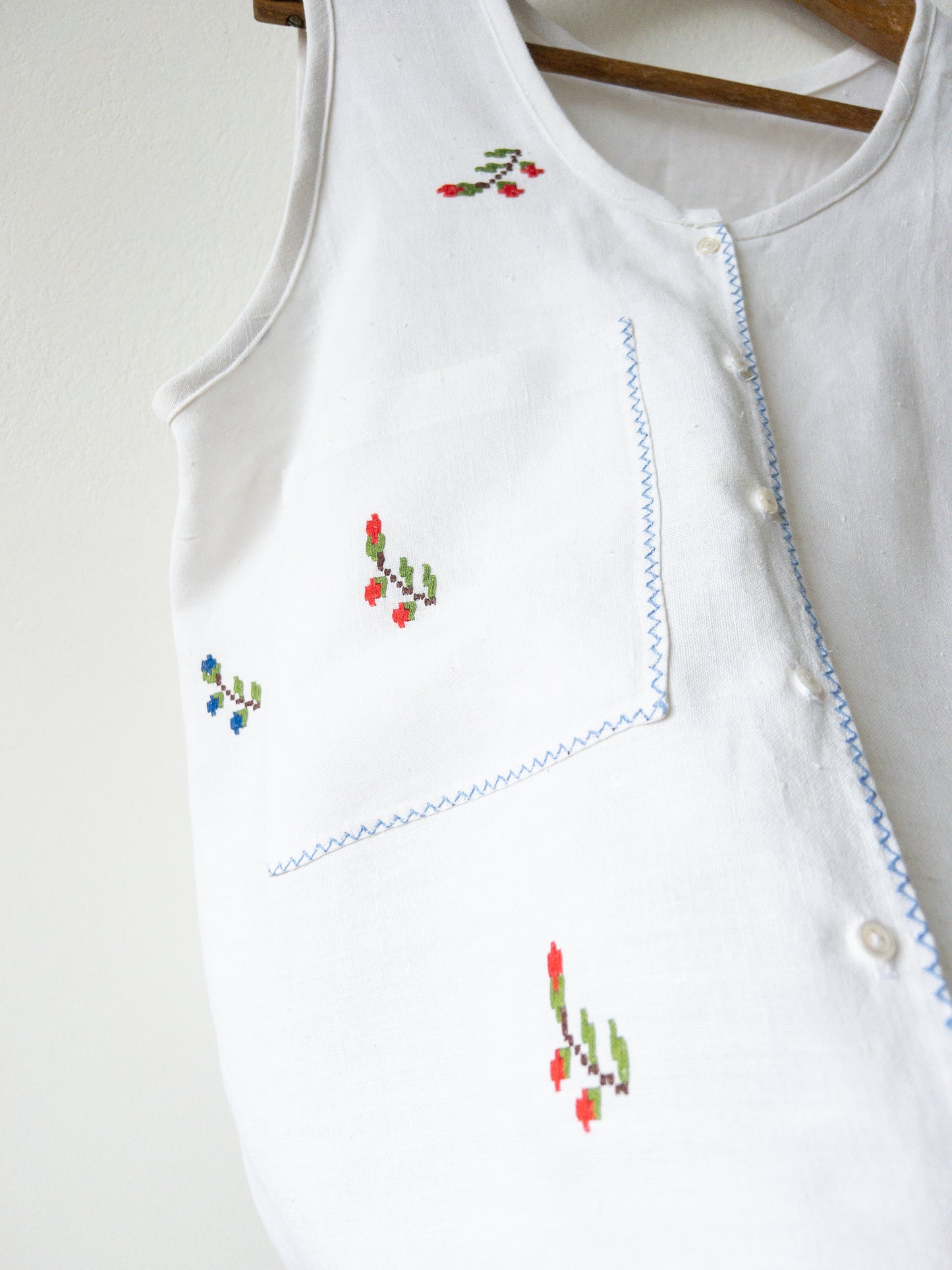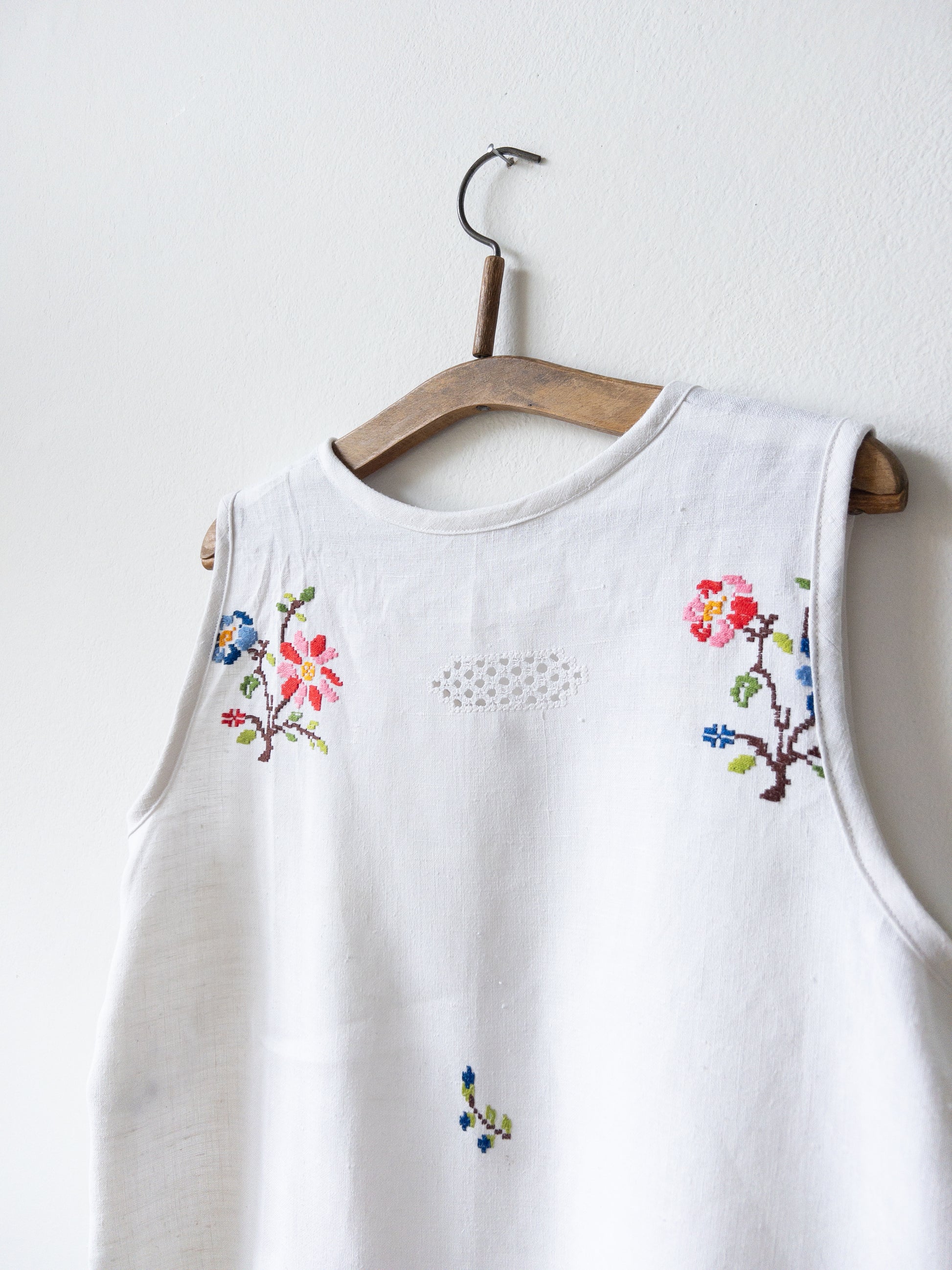 Košeľa bez rukávov ušitá zo starého vyšívaéhnéo obrusu. Vnútro aj vonkajšie lemy sú olemované šikmým prúžkom a celá košeľa je doplnená starými perleťovými gombíkmi.
