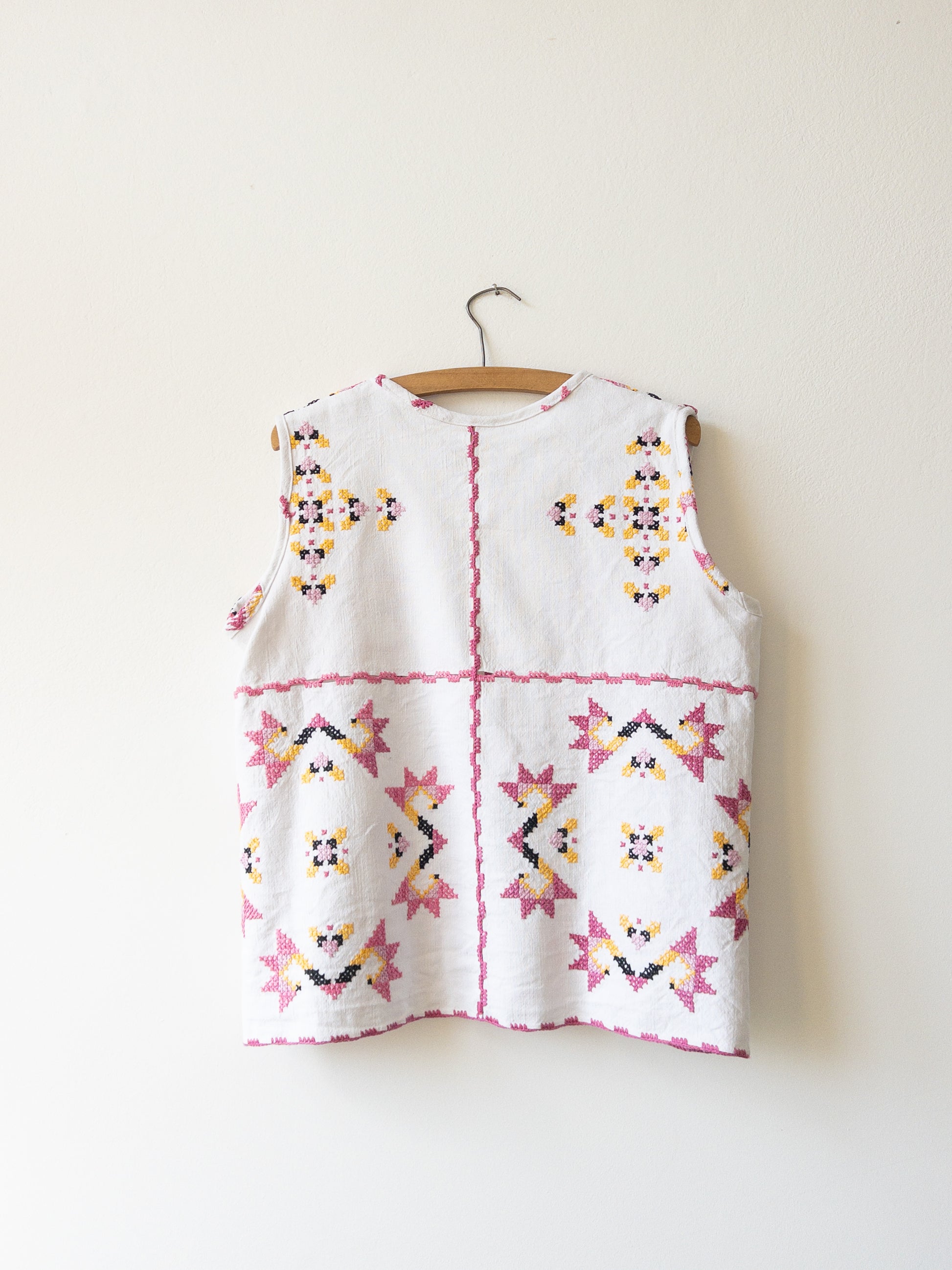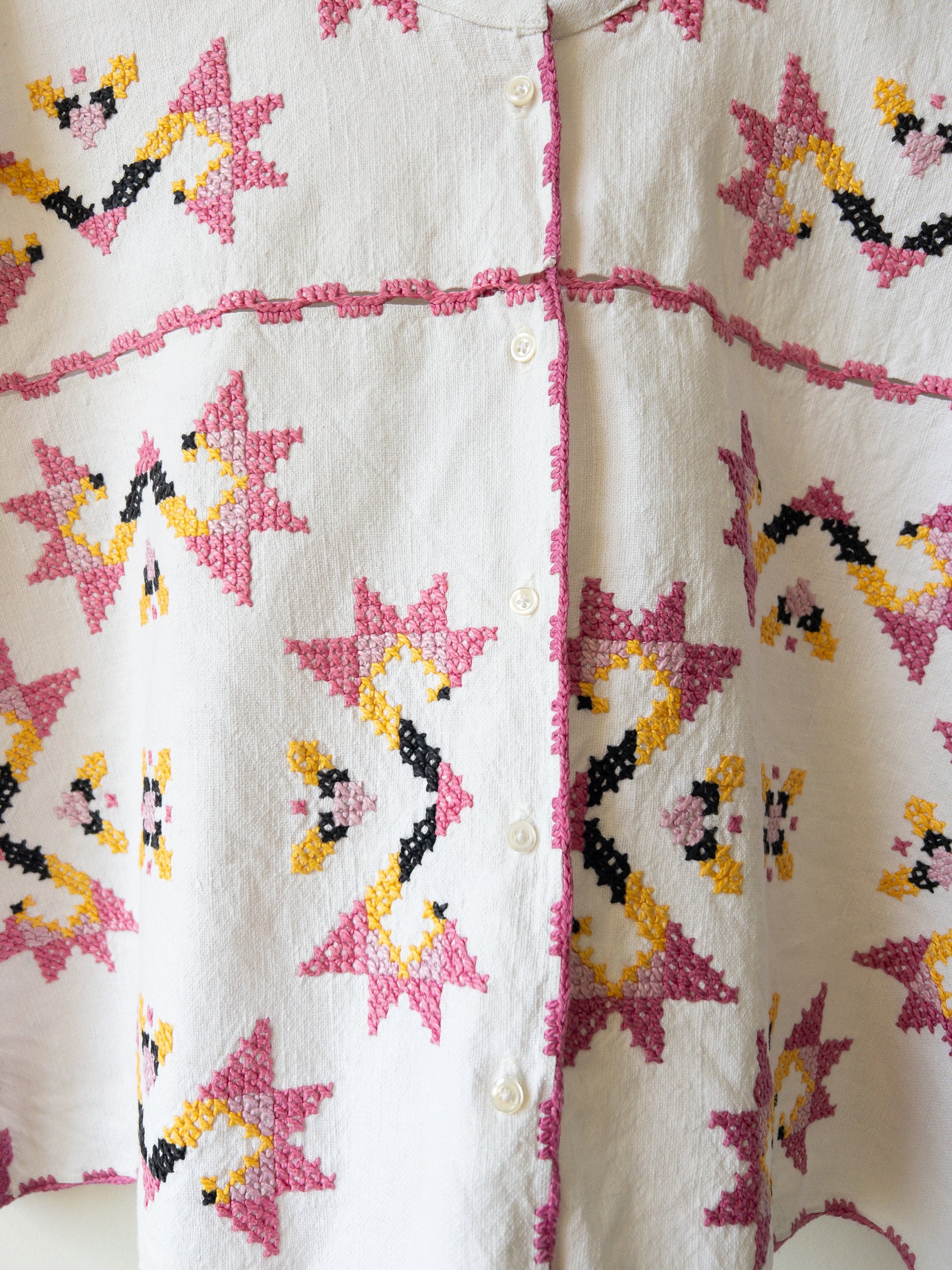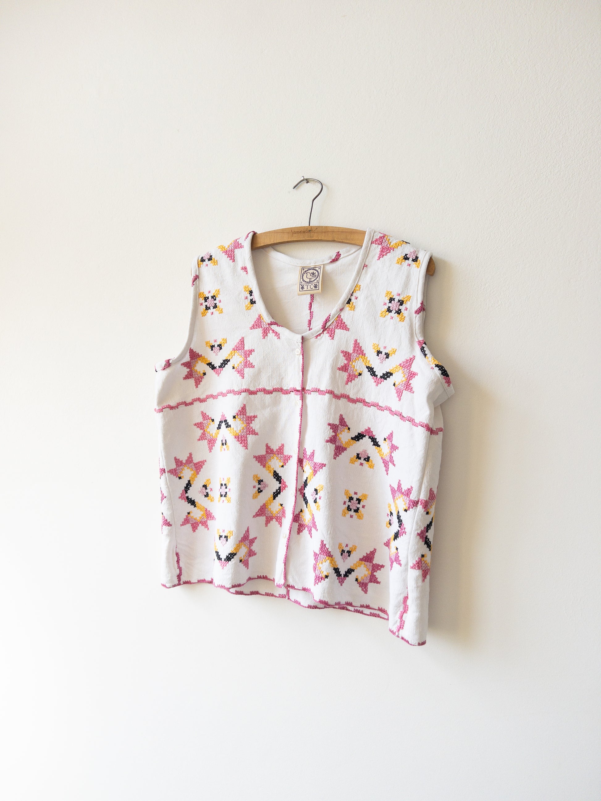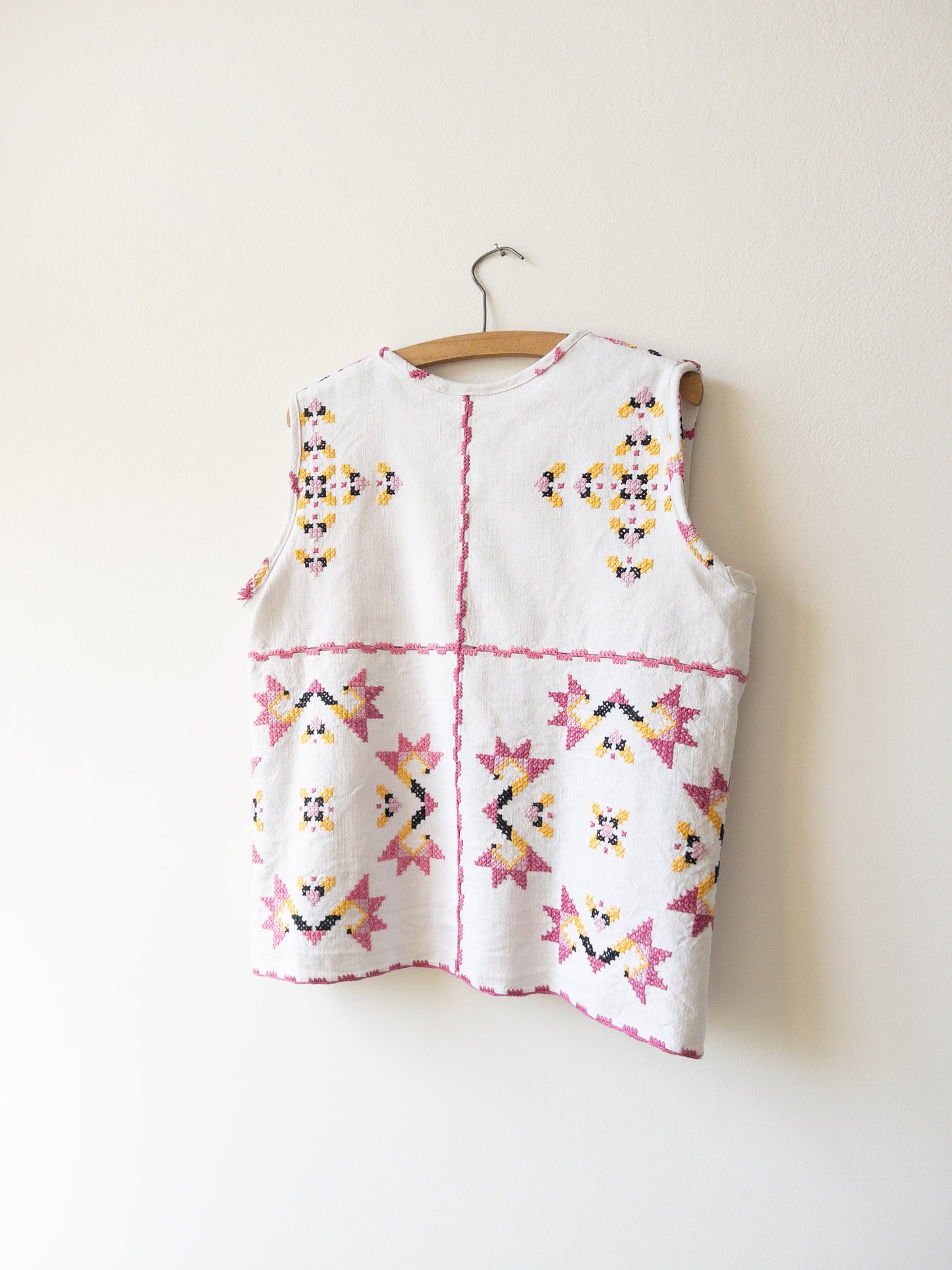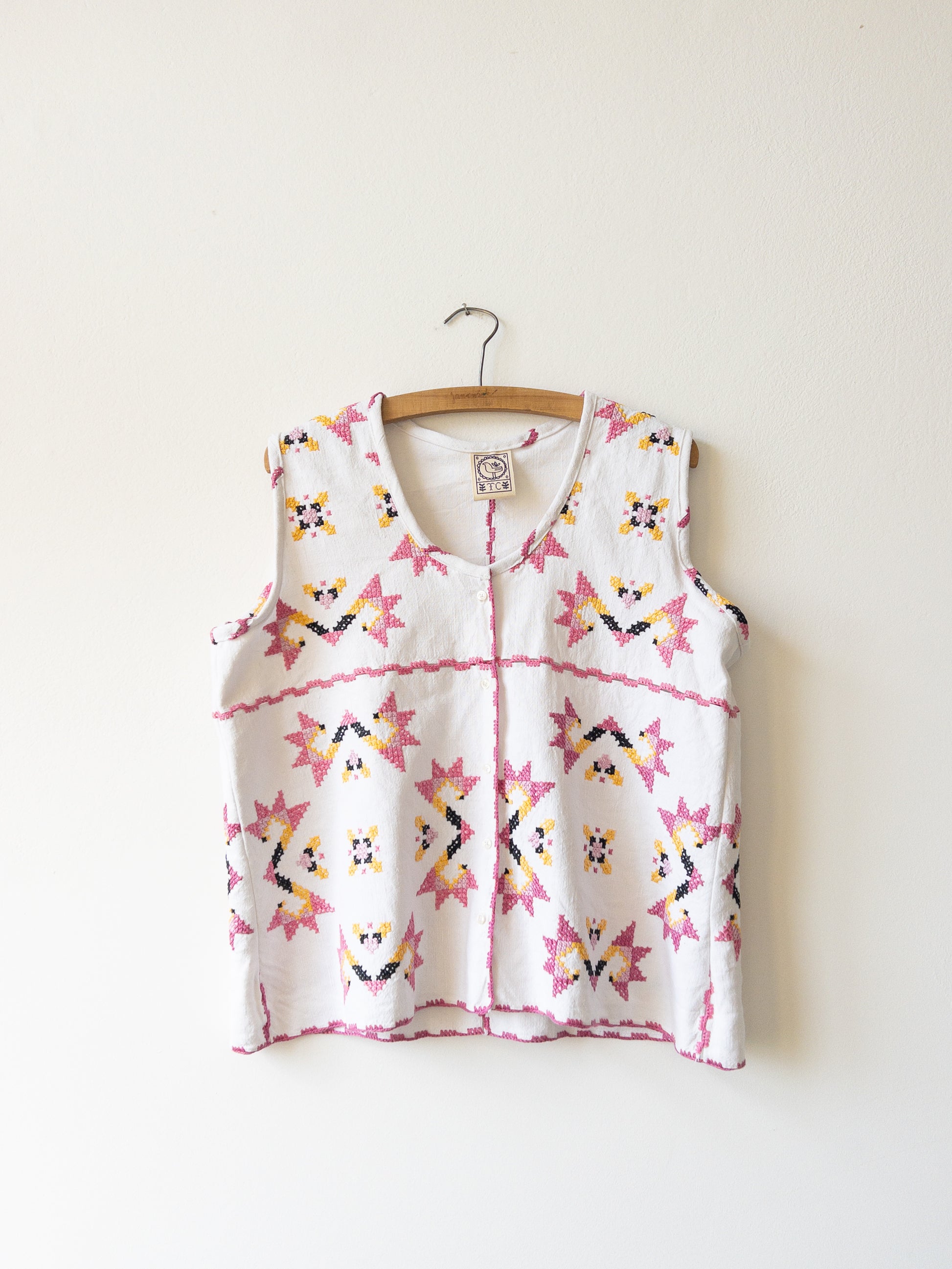 Košeľa bez rukávov ušitá zo starého vyšívaéhnéo obrusu. Vnútro aj vonkajšie lemy sú olemované šikmým prúžkom a celá košeľa je doplnená starými perleťovými gombíkmi.