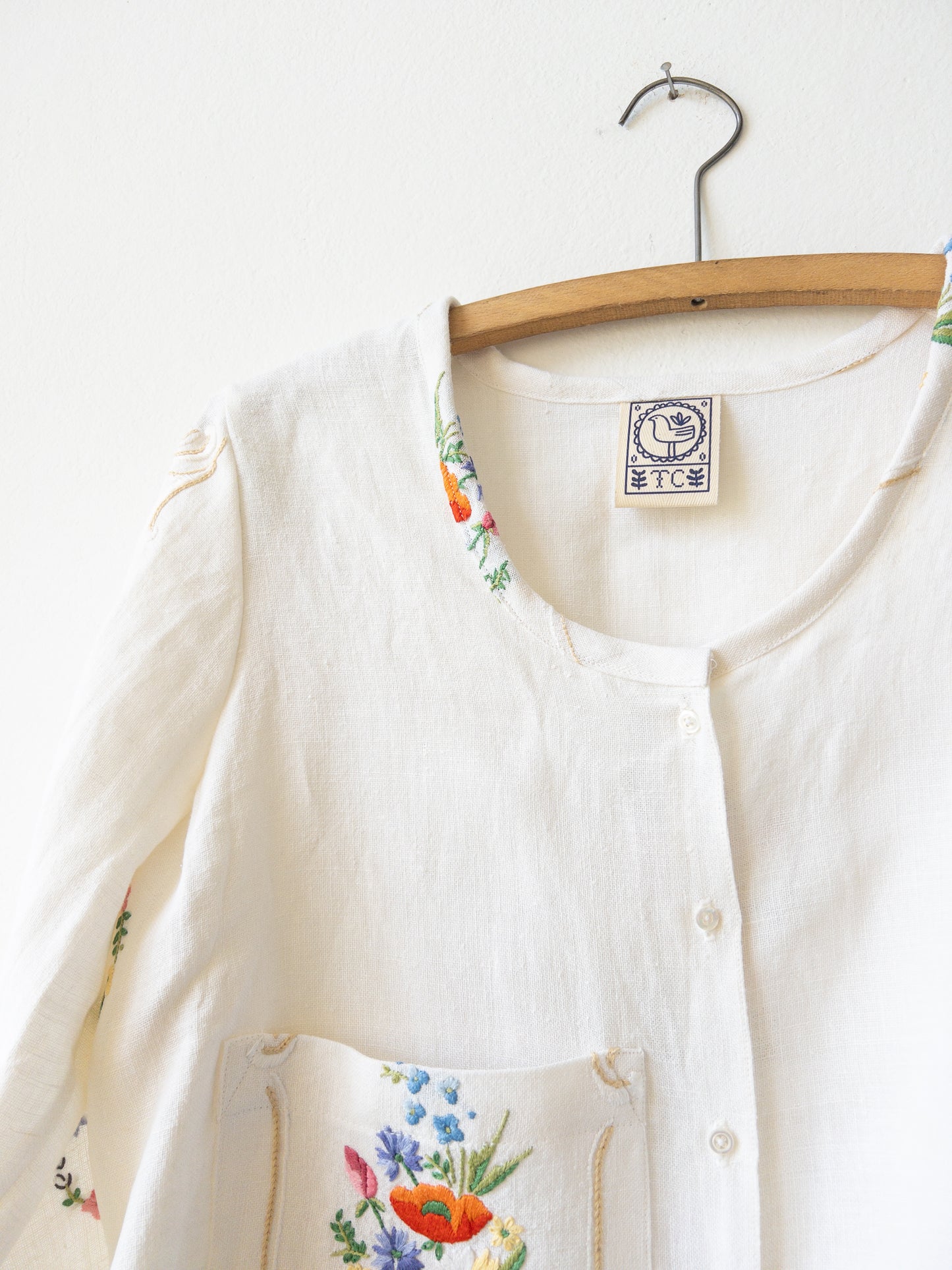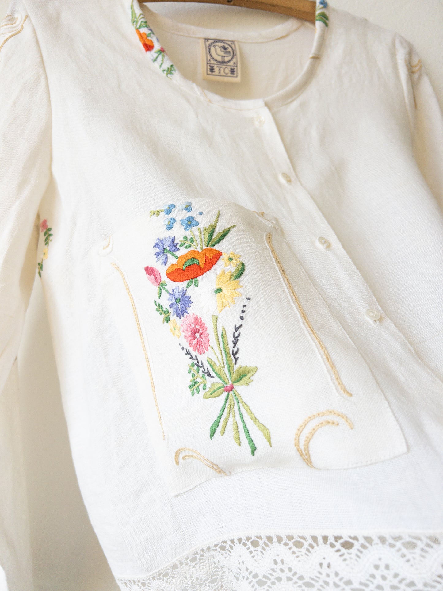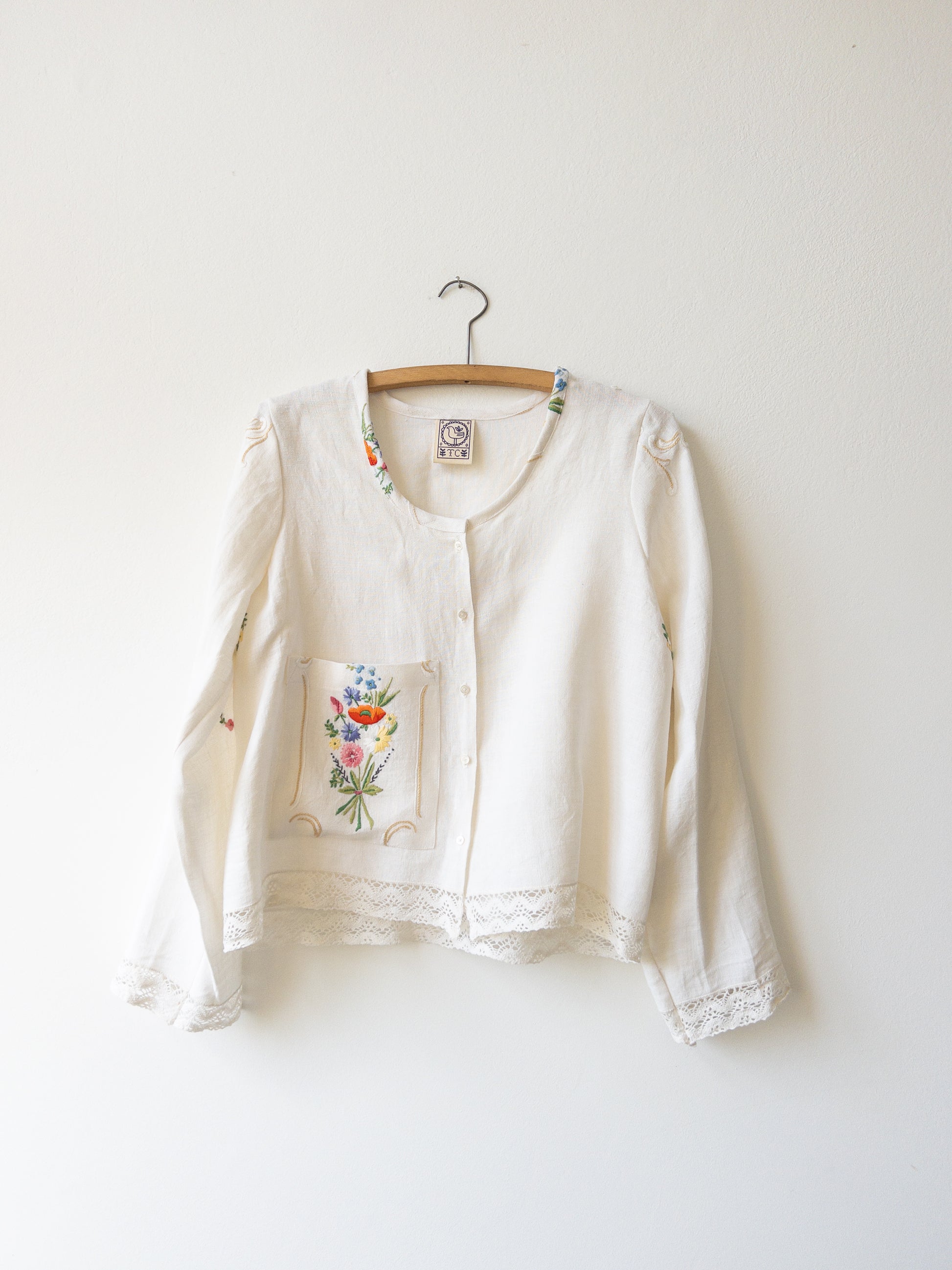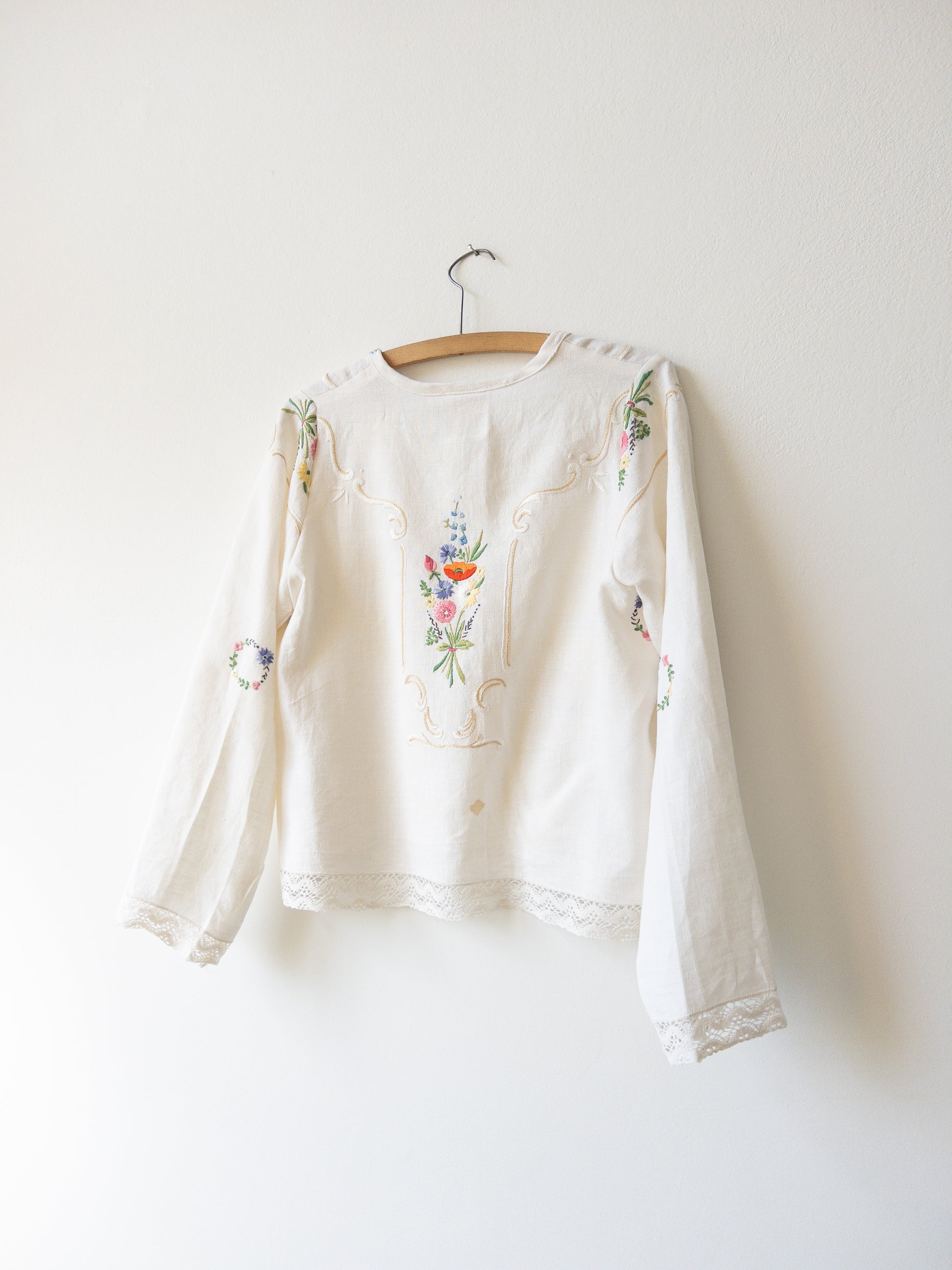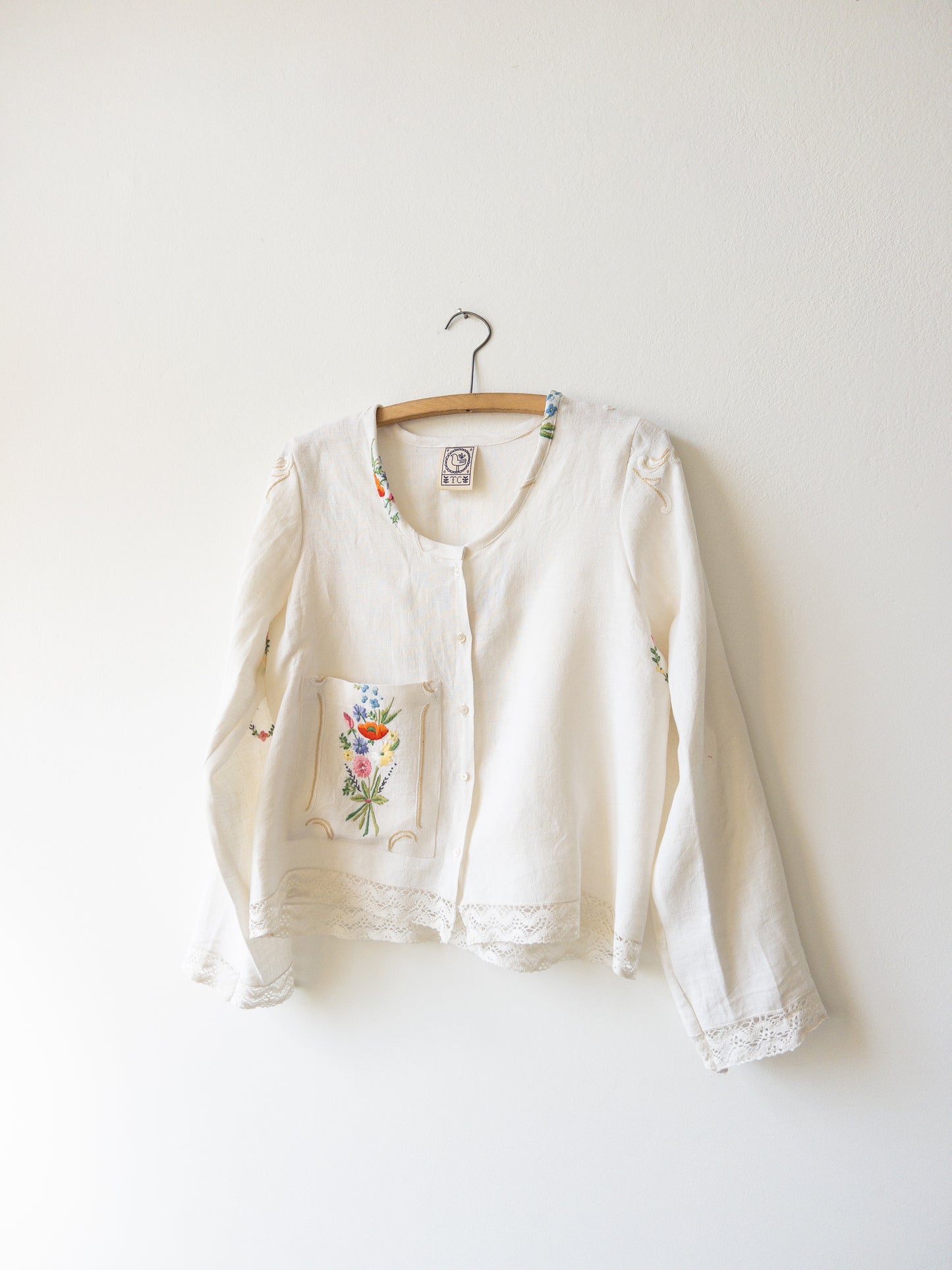 Obrus, z ktorého je košeľa je ušitá, je ručne vyšívaný a starý až 80 rokov a tak sa môže stať, že na košeli nájdete malú nezrovnalosť. Fliačik alebo dierku, ktorá rozpráva jej príbeh. Berte to prosím pri kúpe na vedomie a jej prípadné malé chybičky velebte.