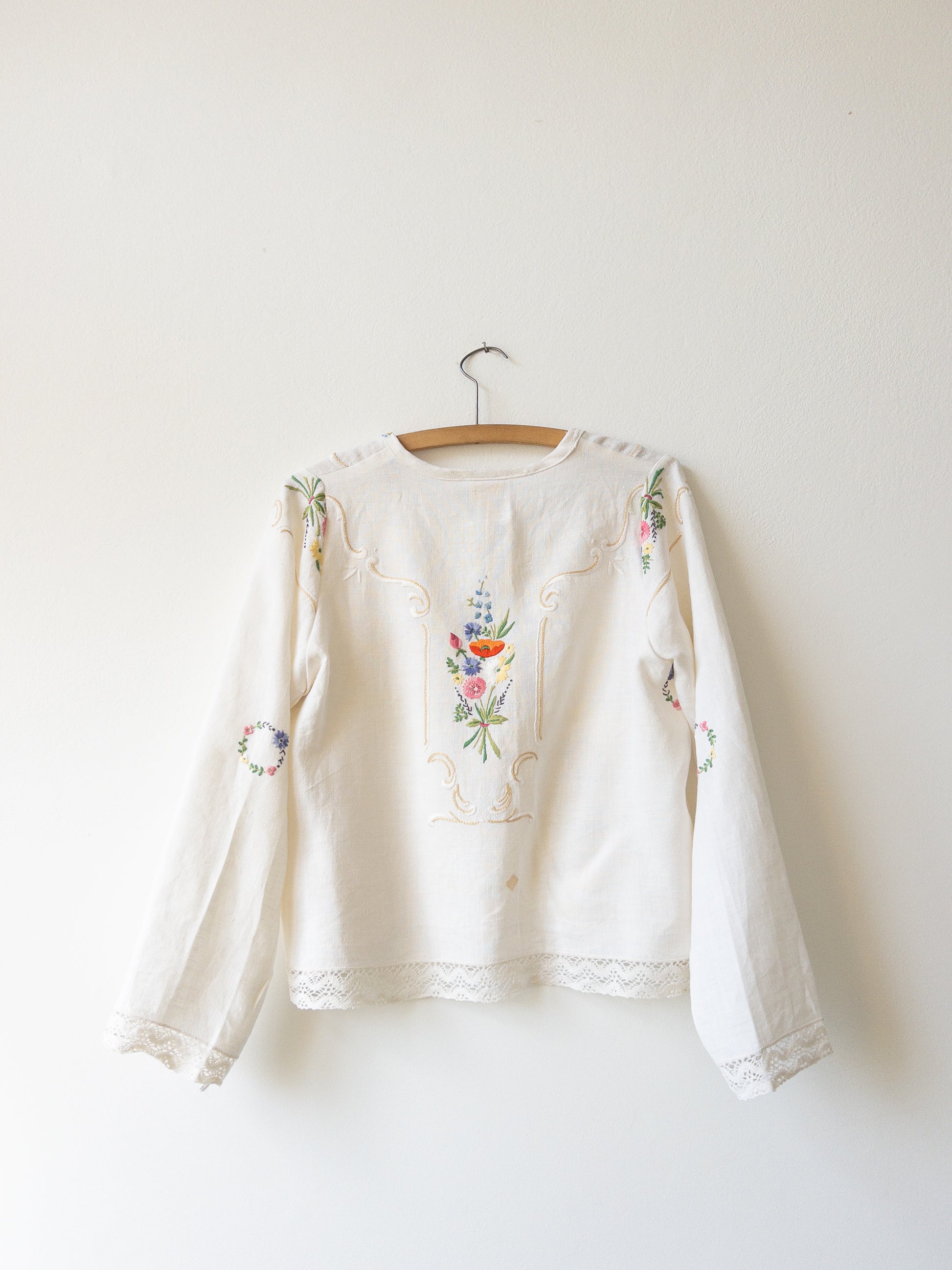 Košeľa s rukávmi ušitá zo starého vyšívaného obrusu. Vnútro aj vonkajšie lemy sú olemované šikmým prúžkom a celá košeľa je doplnená starými perleťovými gombíkmi.