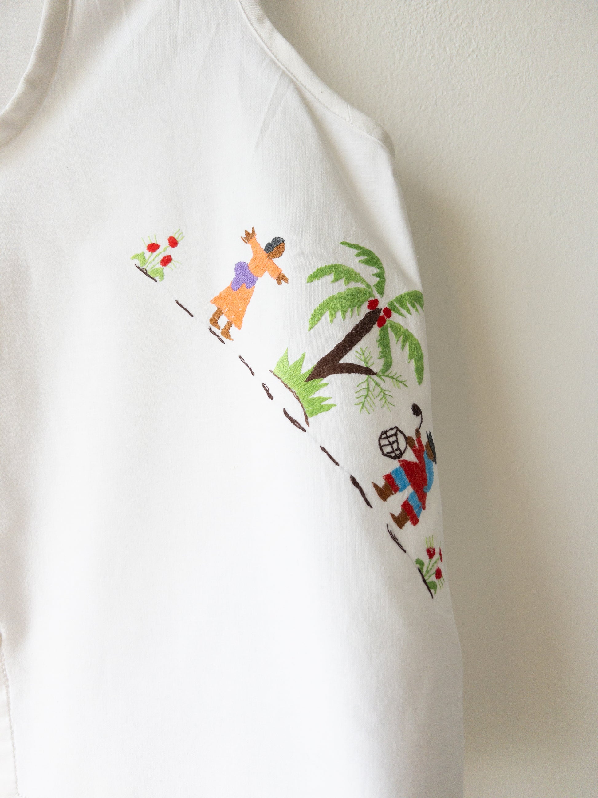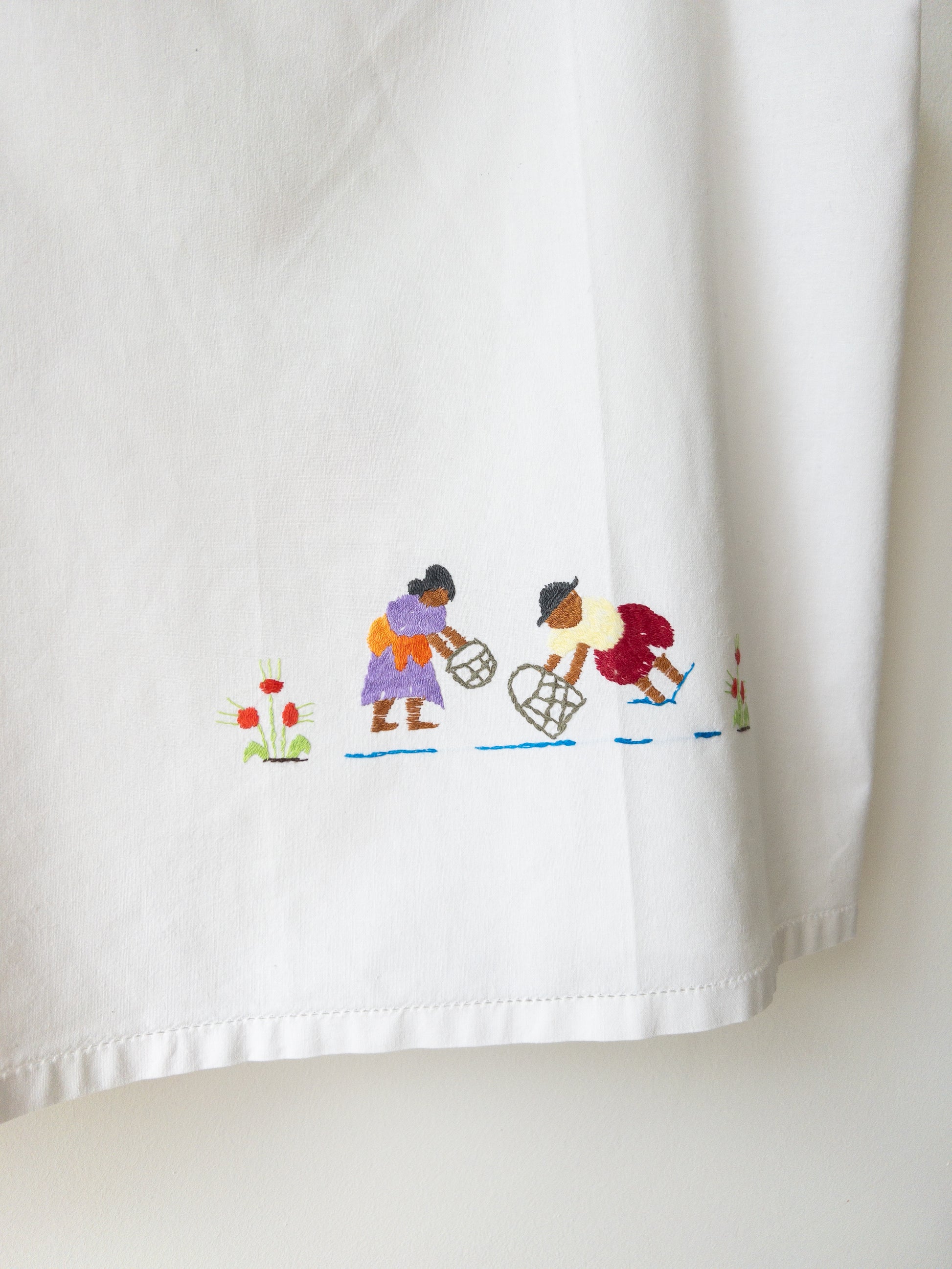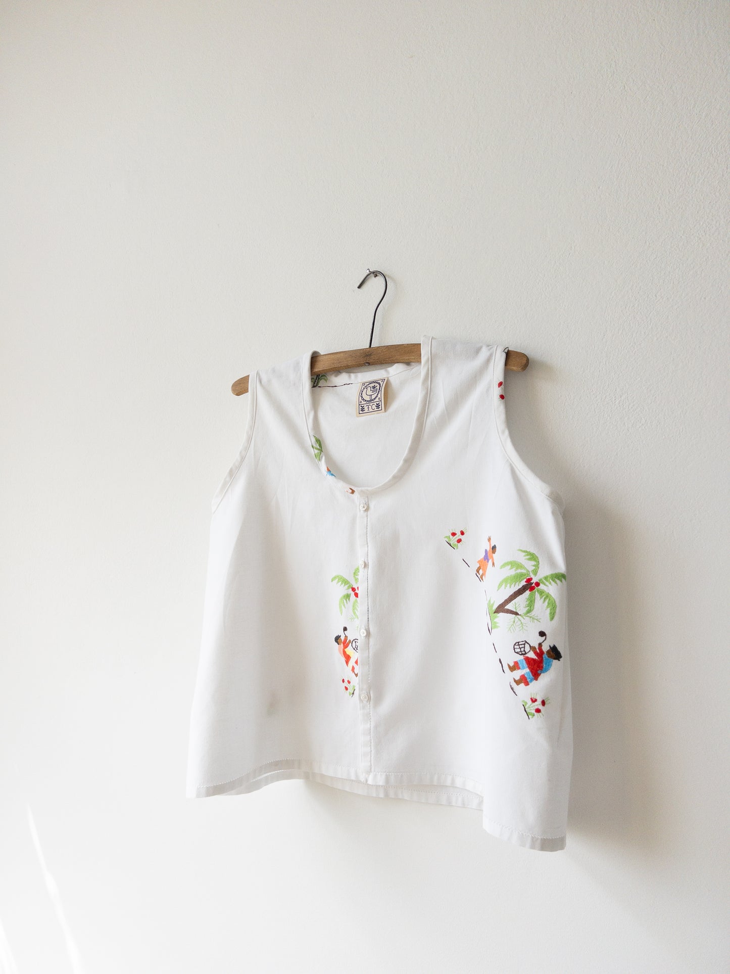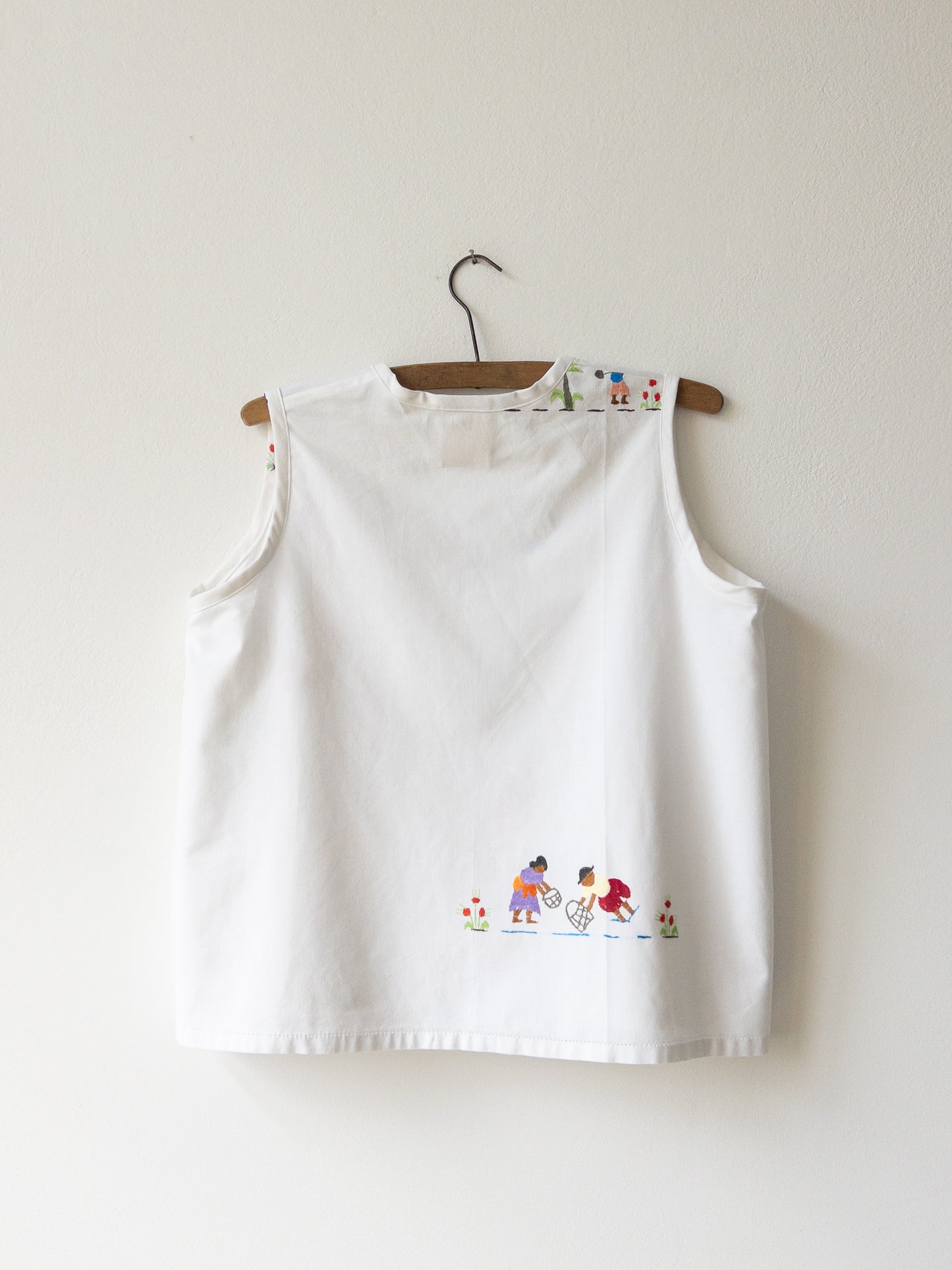 Košeľa bez rukávov ušitá zo starého vyšívaéhnéo obrusu. Vnútro aj vonkajšie lemy sú olemované šikmým prúžkom a celá košeľa je doplnená starými perleťovými gombíkmi.