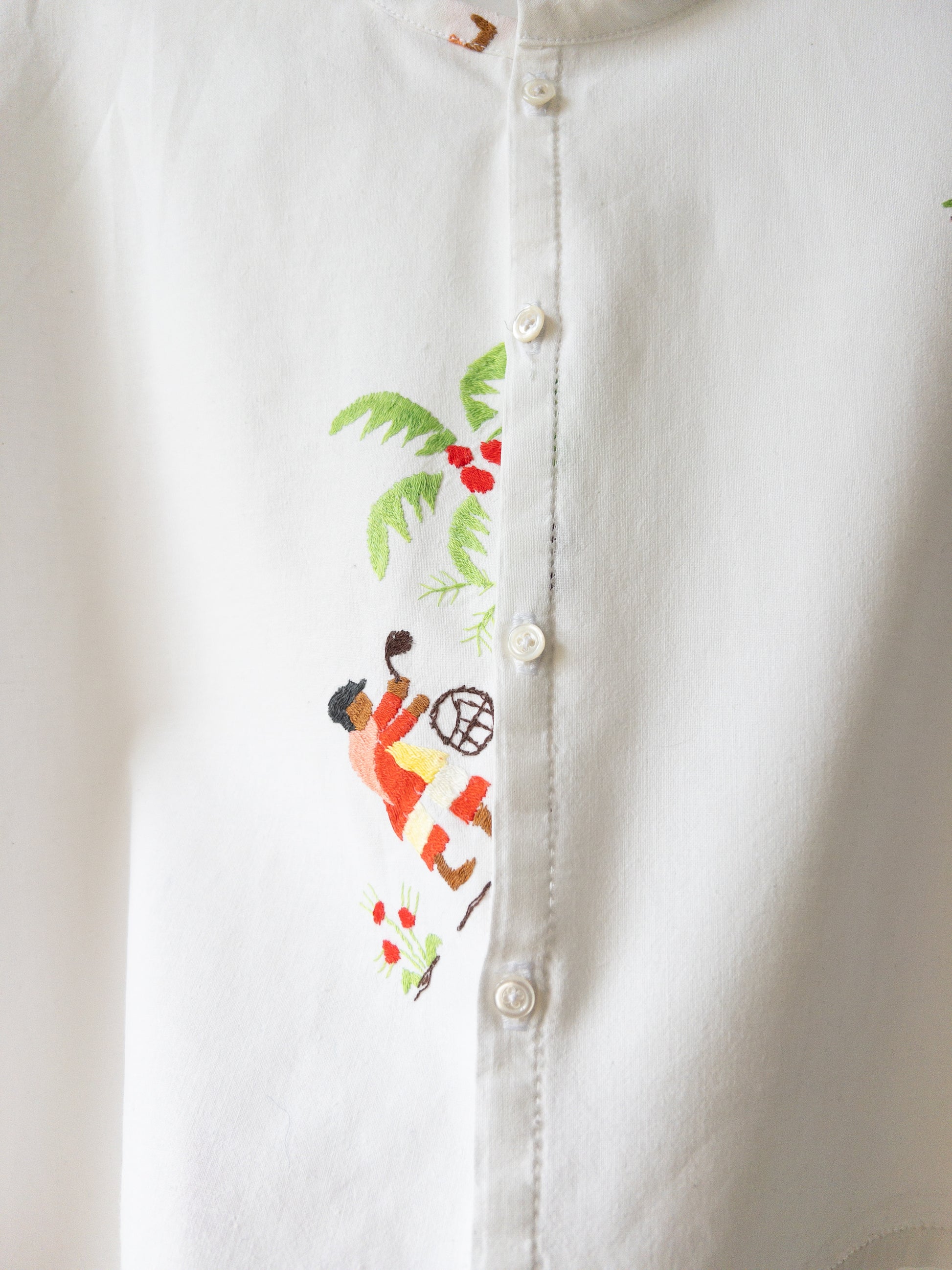 Each shirt is made from an old tablecloth. And it carries a story. I started sewing shirts from tablecloths mainly because of the quality that old, proven fabrics hide in themselves. The overlap of the story came only at the moment when I walked around in one of the shirts made from the tablecloth.