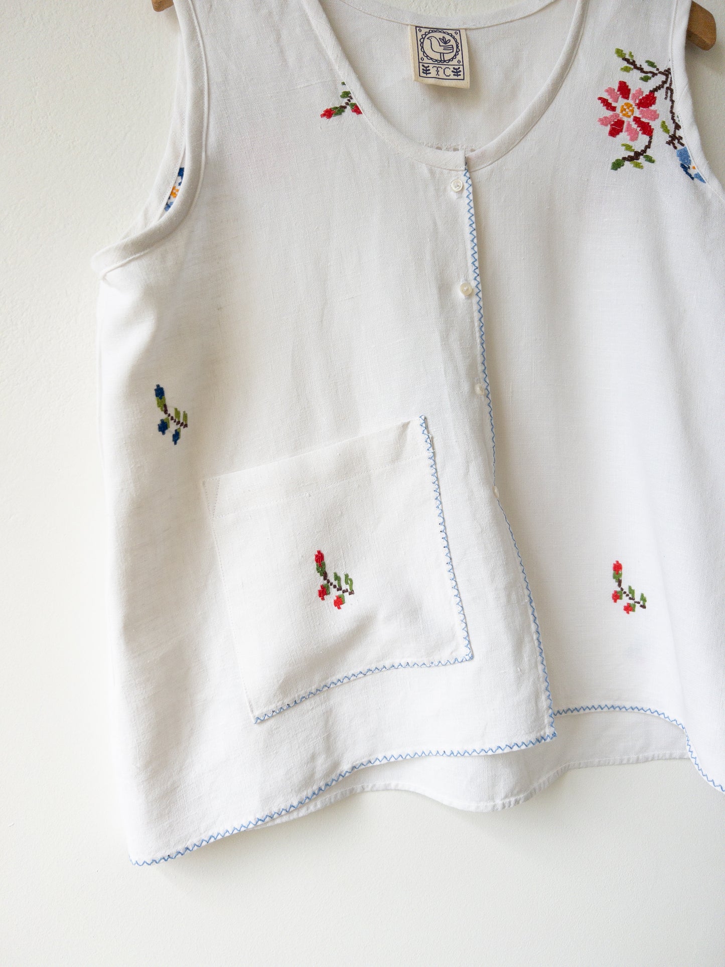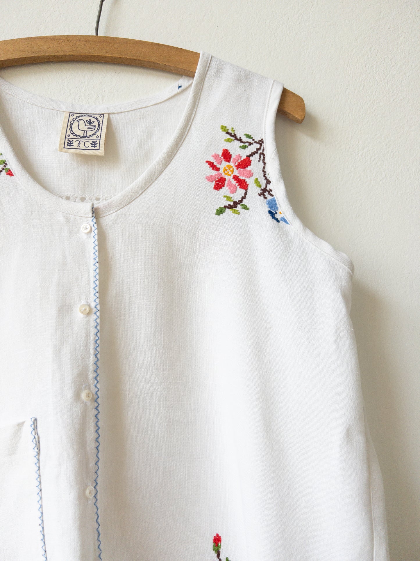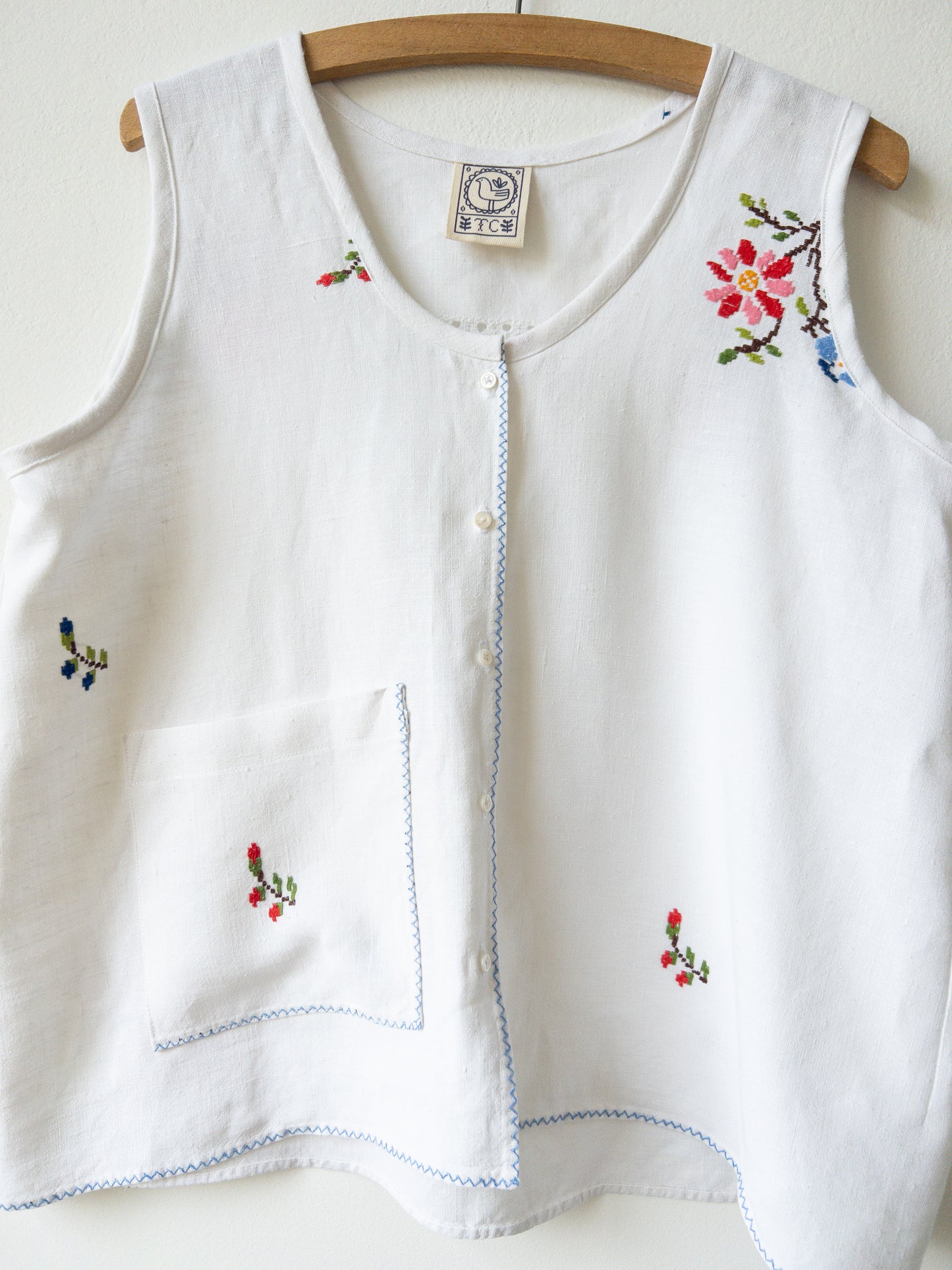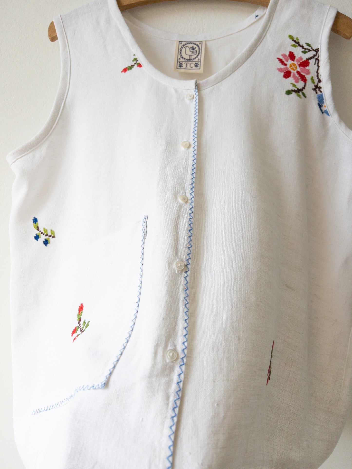 Košeľa bez rukávov ušitá zo starého vyšívaéhnéo obrusu. Vnútro aj vonkajšie lemy sú olemované šikmým prúžkom a celá košeľa je doplnená starými perleťovými gombíkmi.