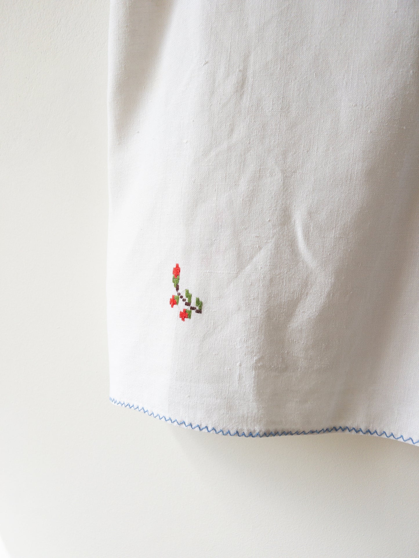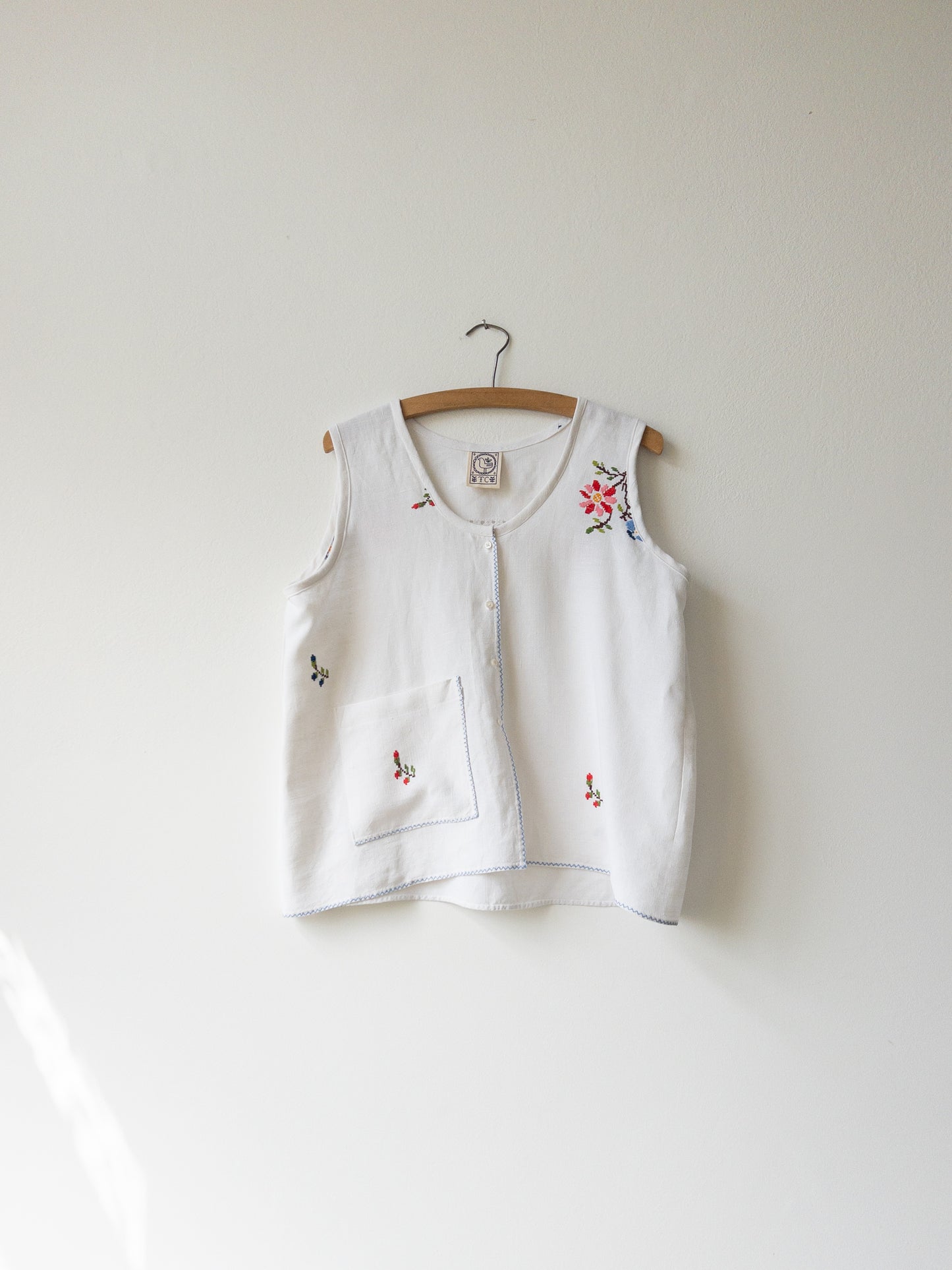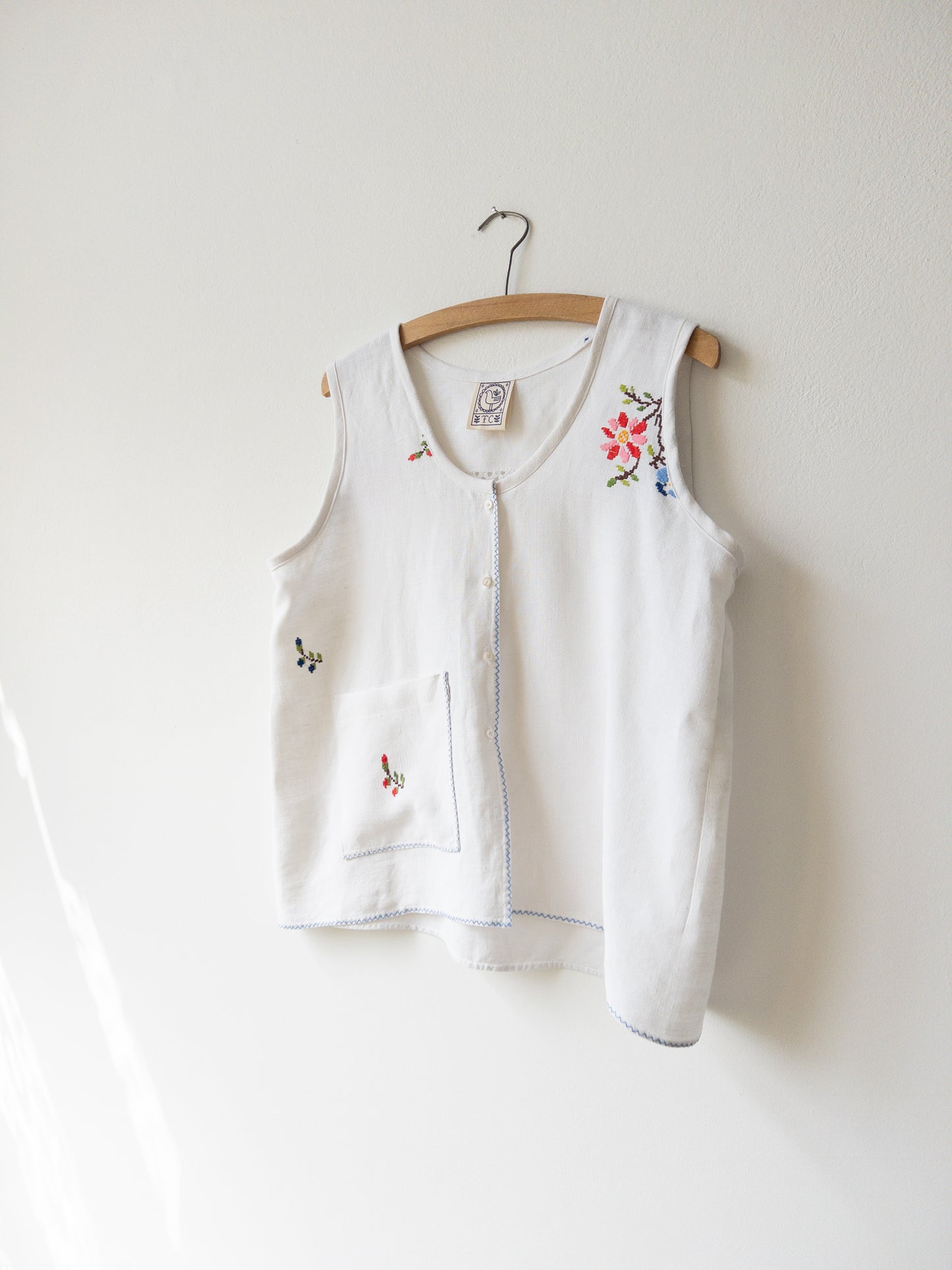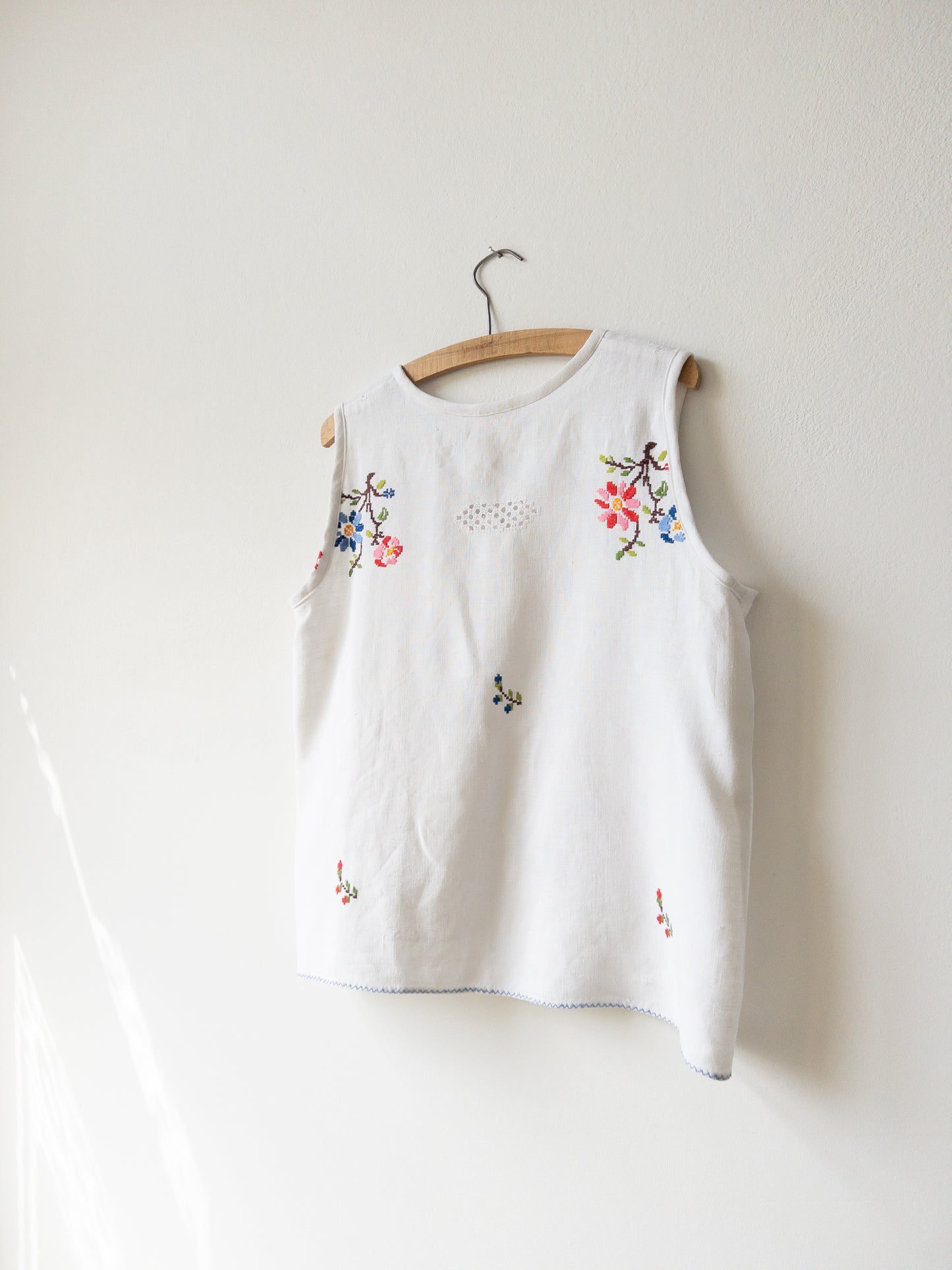 Košeľa bez rukávov ušitá zo starého vyšívaéhnéo obrusu. Vnútro aj vonkajšie lemy sú olemované šikmým prúžkom a celá košeľa je doplnená starými perleťovými gombíkmi.