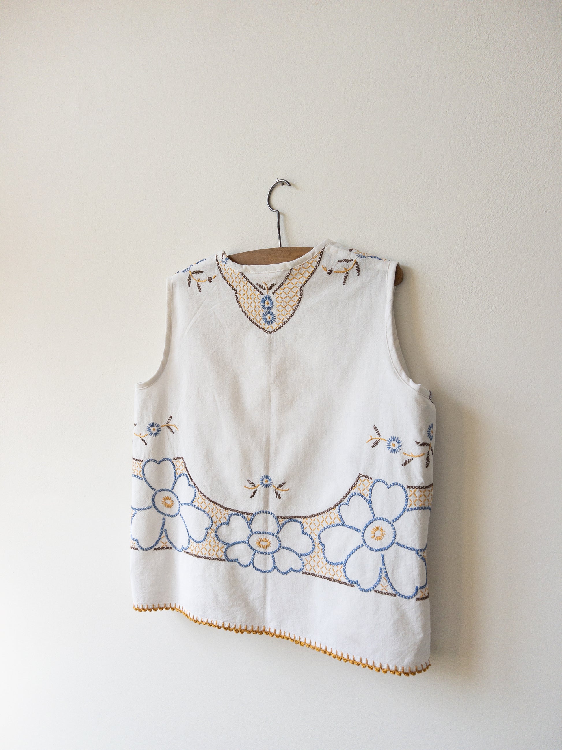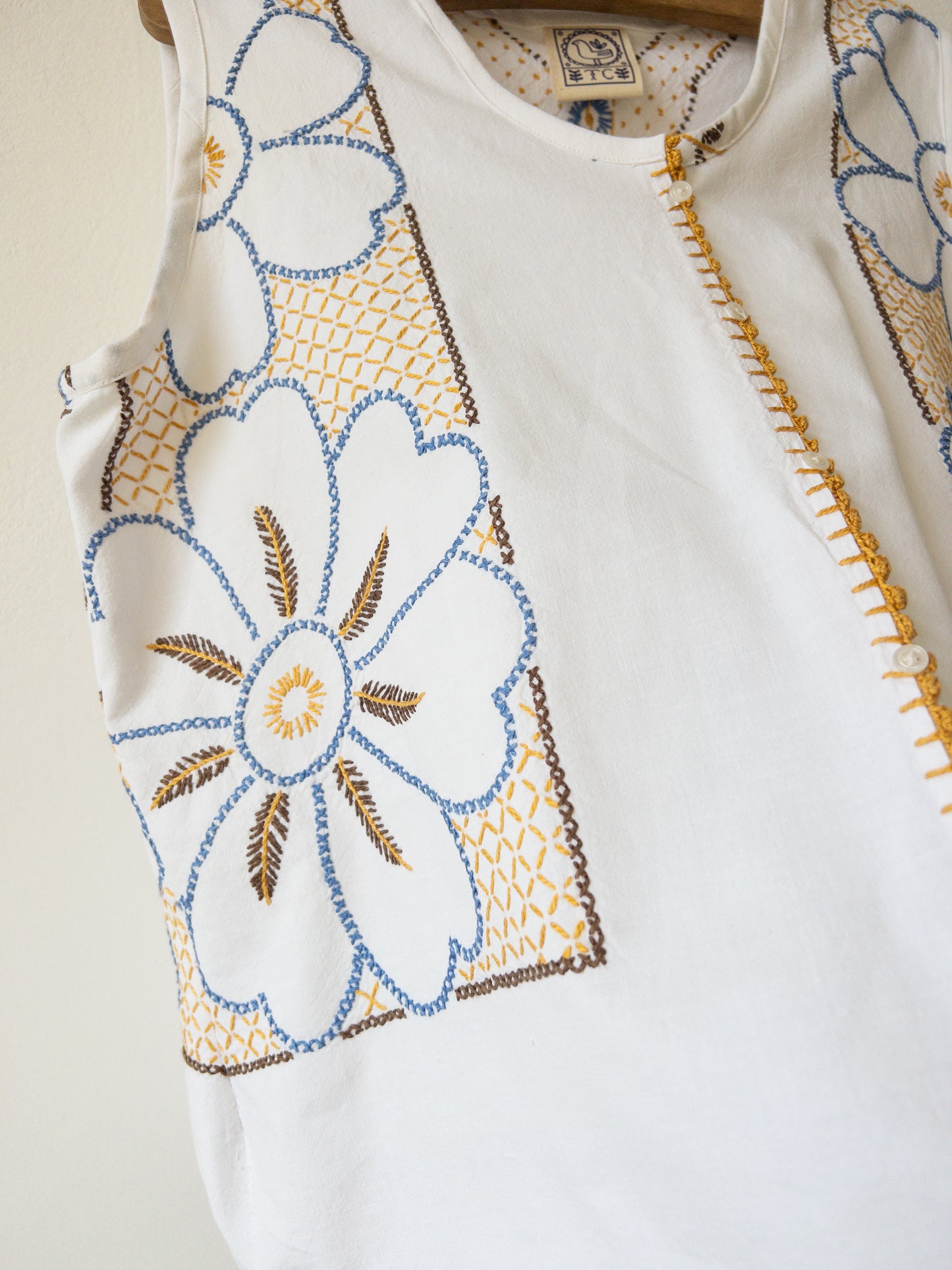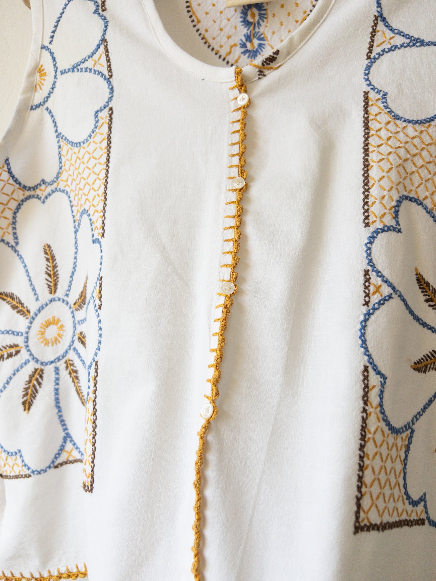 Košeľa bez rukávov ušitá zo starého vyšívaéhnéo obrusu. Vnútro aj vonkajšie lemy sú olemované šikmým prúžkom a celá košeľa je doplnená starými perleťovými gombíkmi.