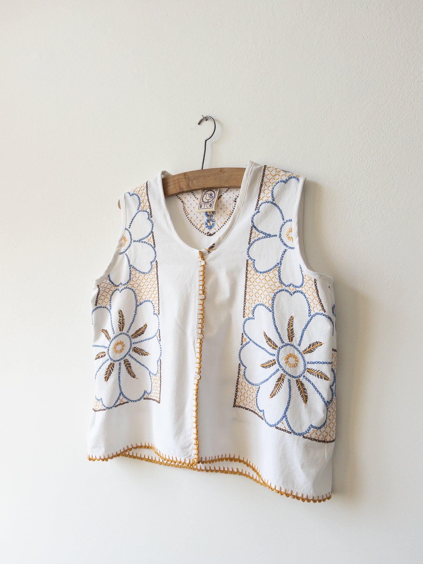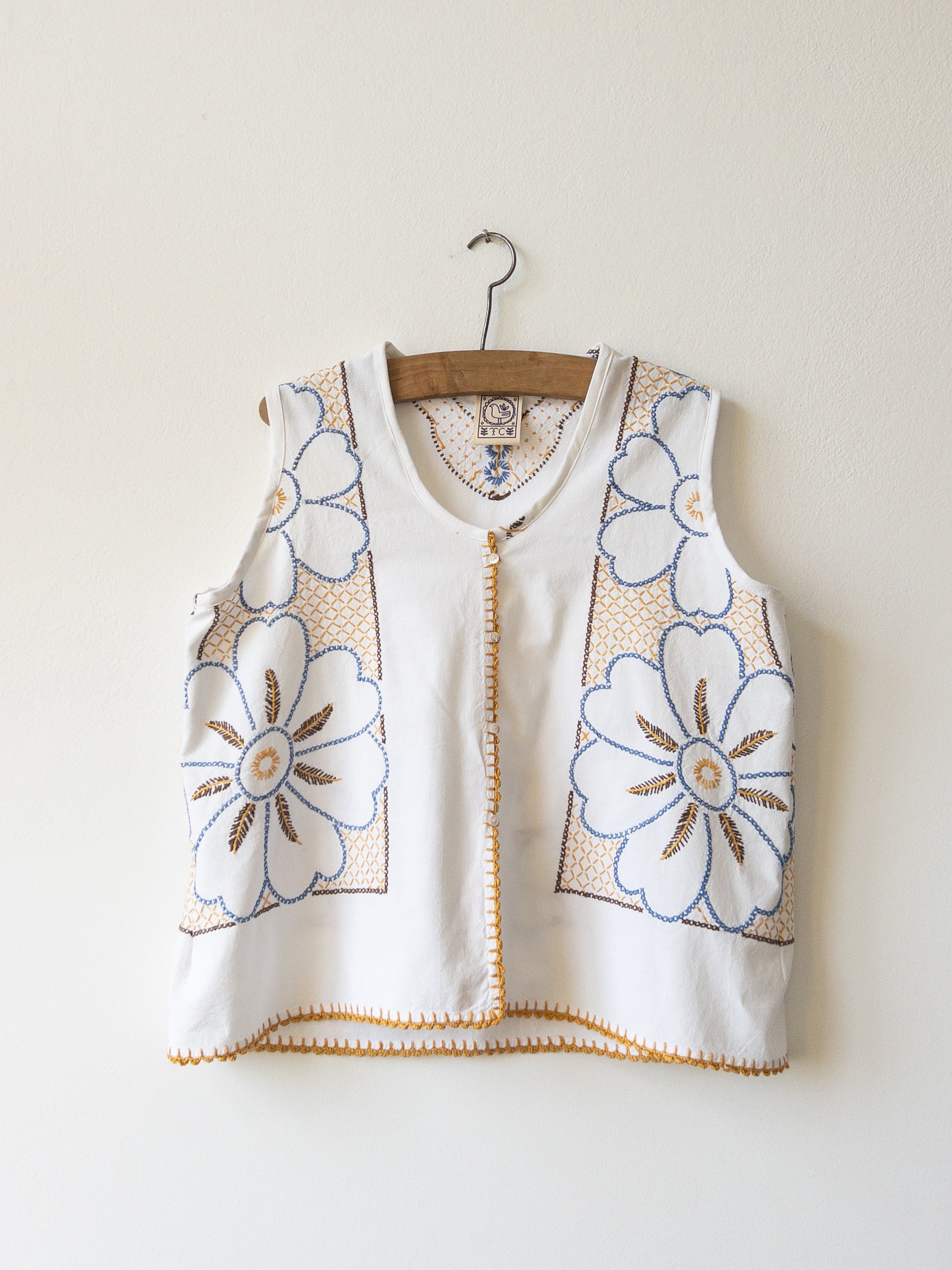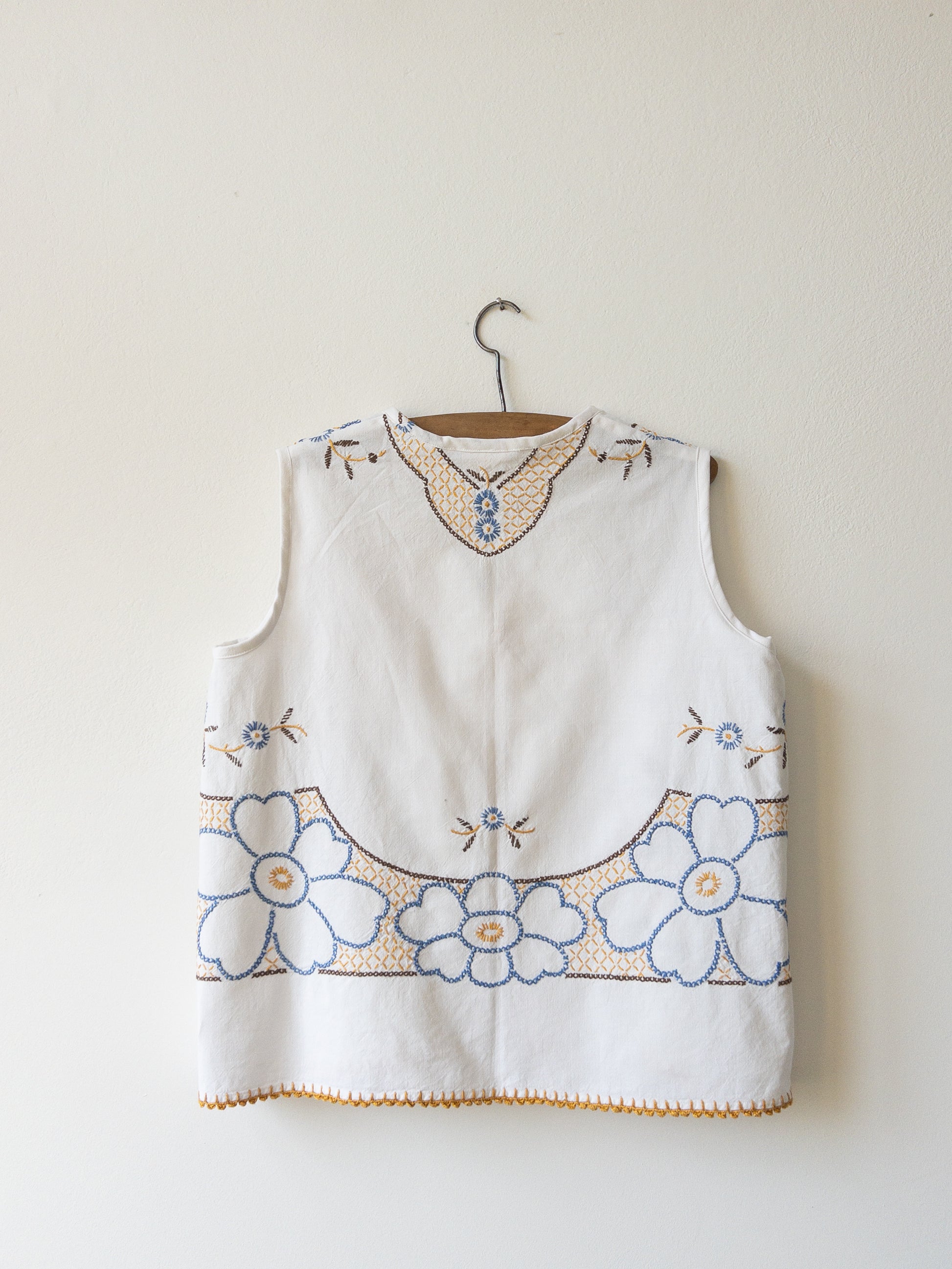 Košeľa bez rukávov ušitá zo starého vyšívaéhnéo obrusu. Vnútro aj vonkajšie lemy sú olemované šikmým prúžkom a celá košeľa je doplnená starými perleťovými gombíkmi.