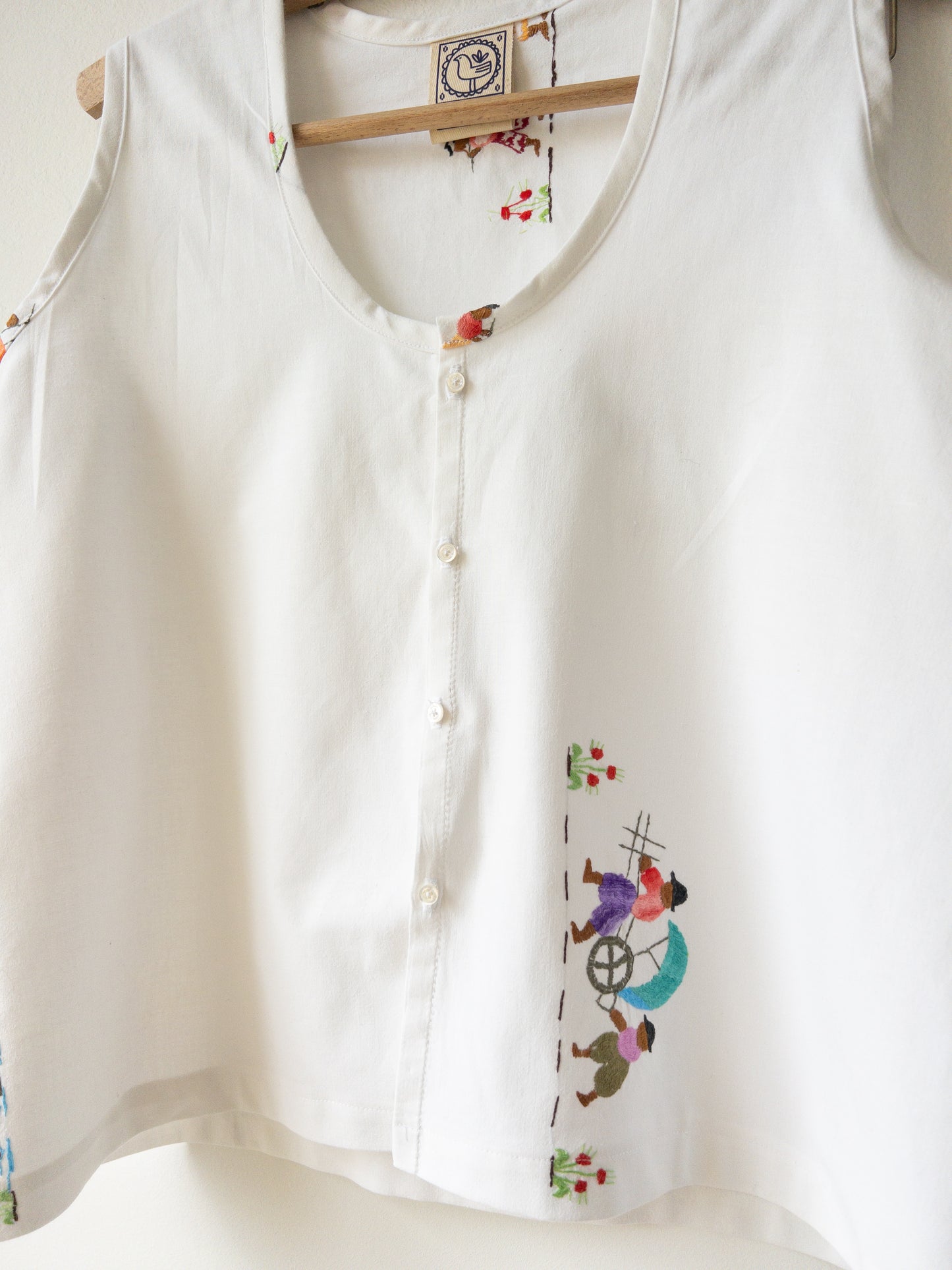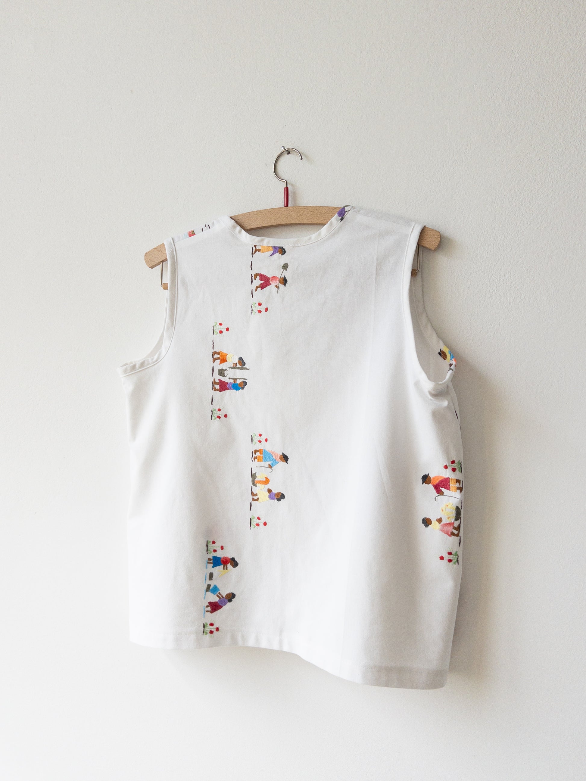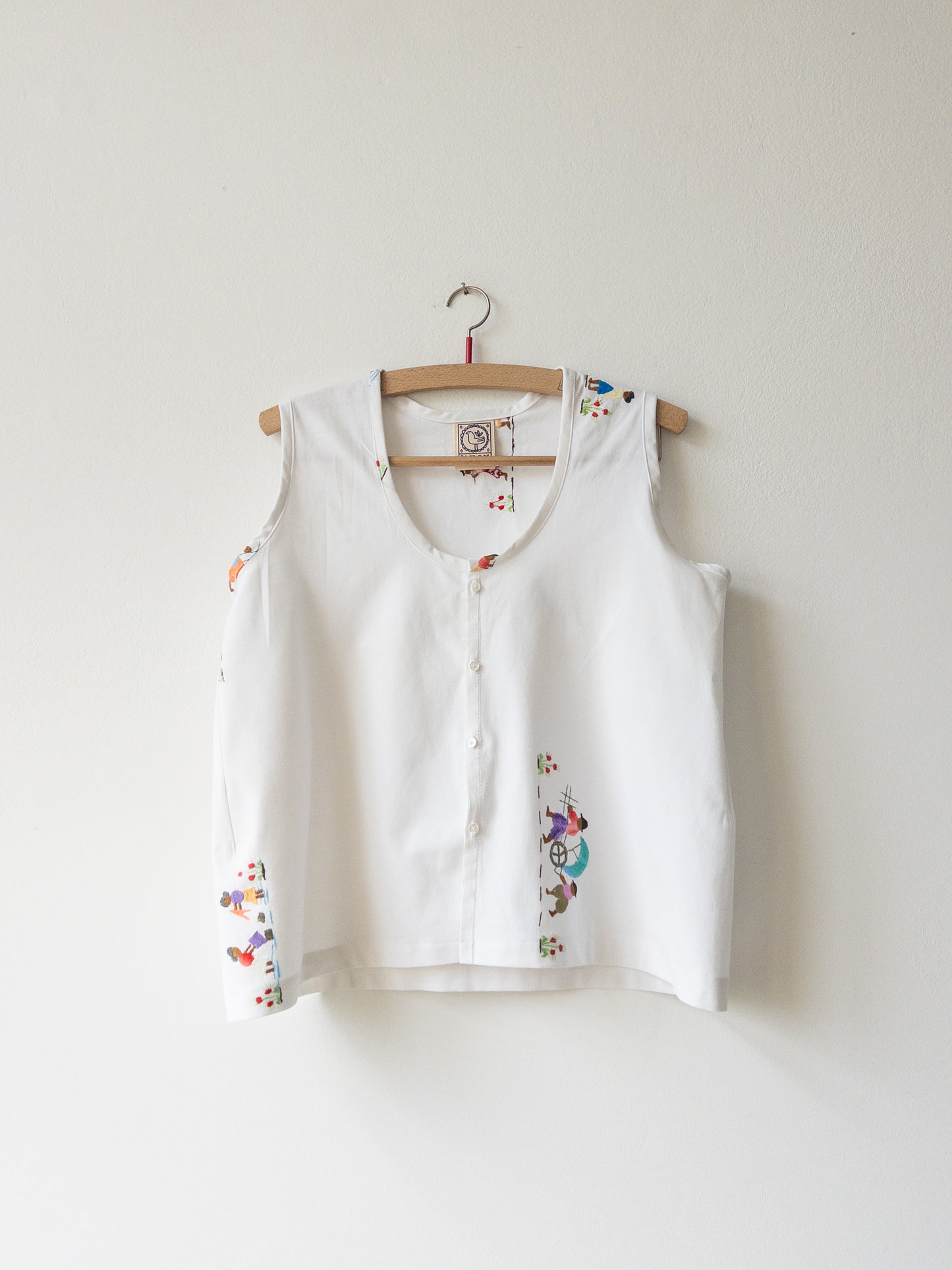 Košeľa bez rukávov ušitá zo starého vyšívaného obrusu. Vnútro aj vonkajšie lemy sú olemované šikmým prúžkom a celá košeľa je doplnená starými perleťovými gombíkmi.