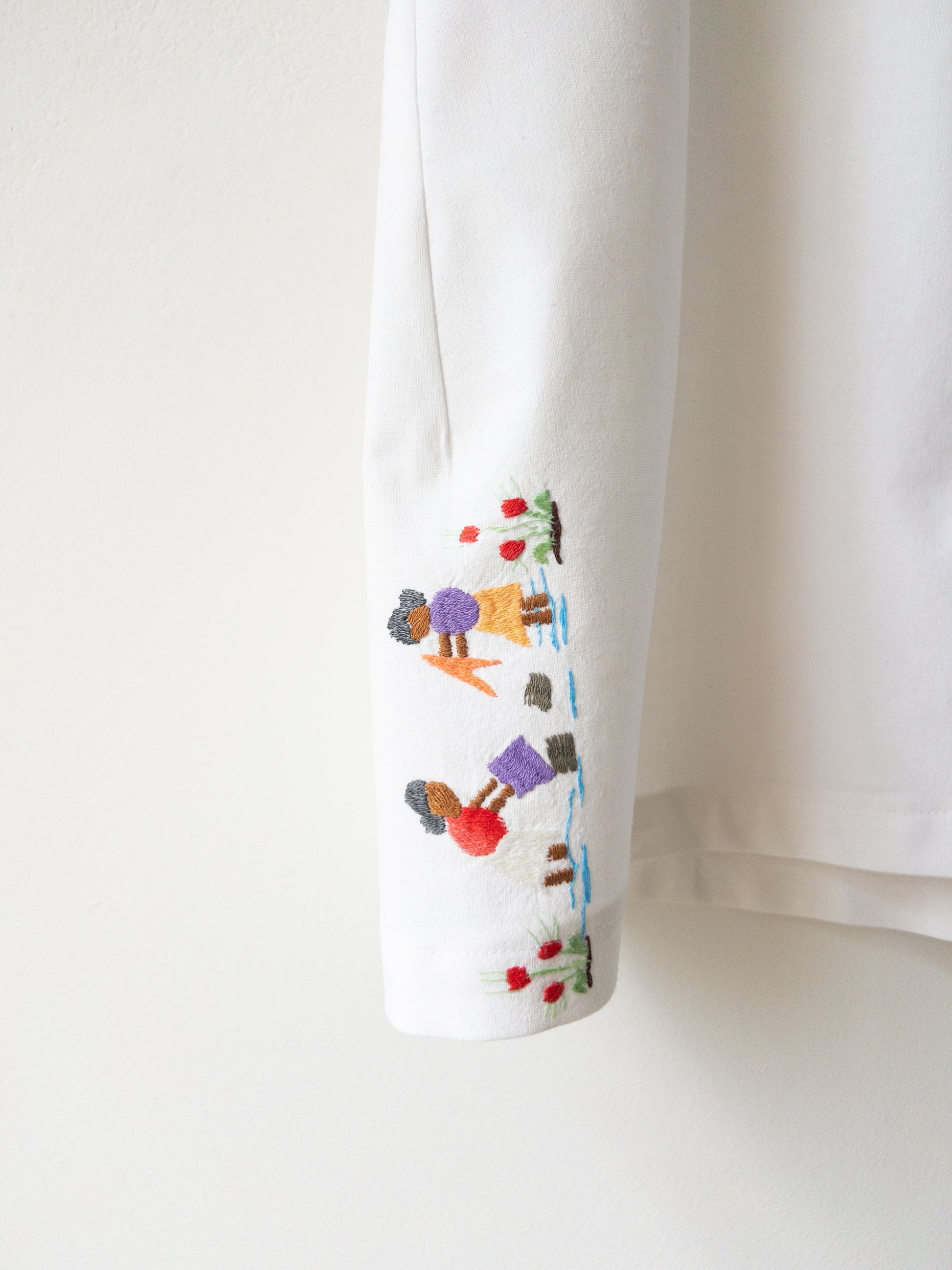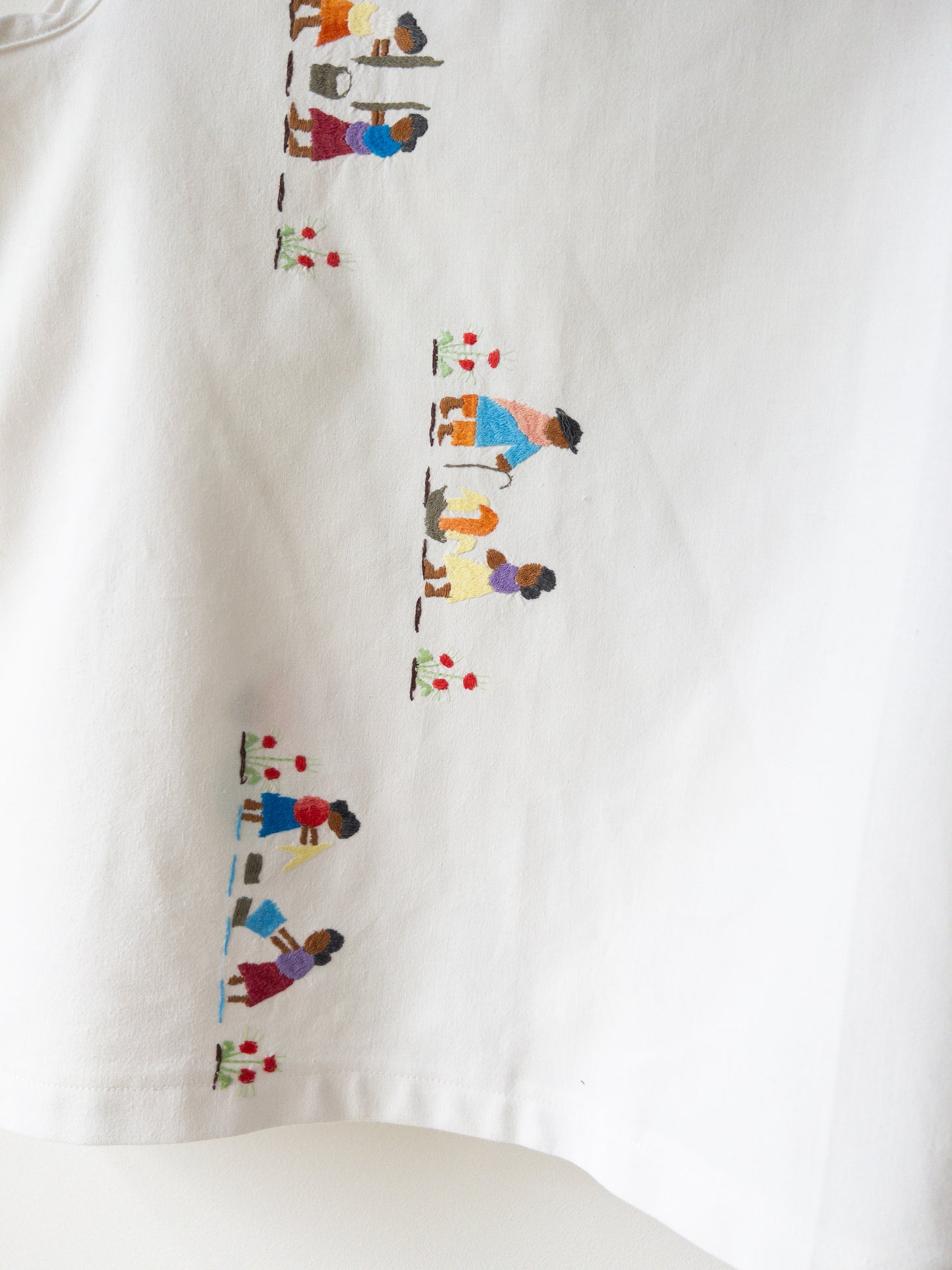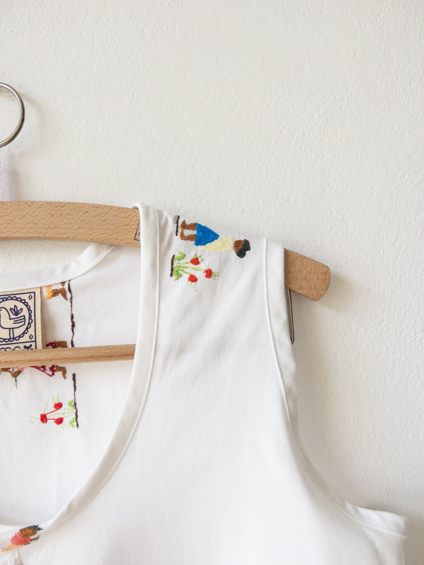Košeľa bez rukávov ušitá zo starého vyšívaného obrusu. Vnútro aj vonkajšie lemy sú olemované šikmým prúžkom a celá košeľa je doplnená starými perleťovými gombíkmi.