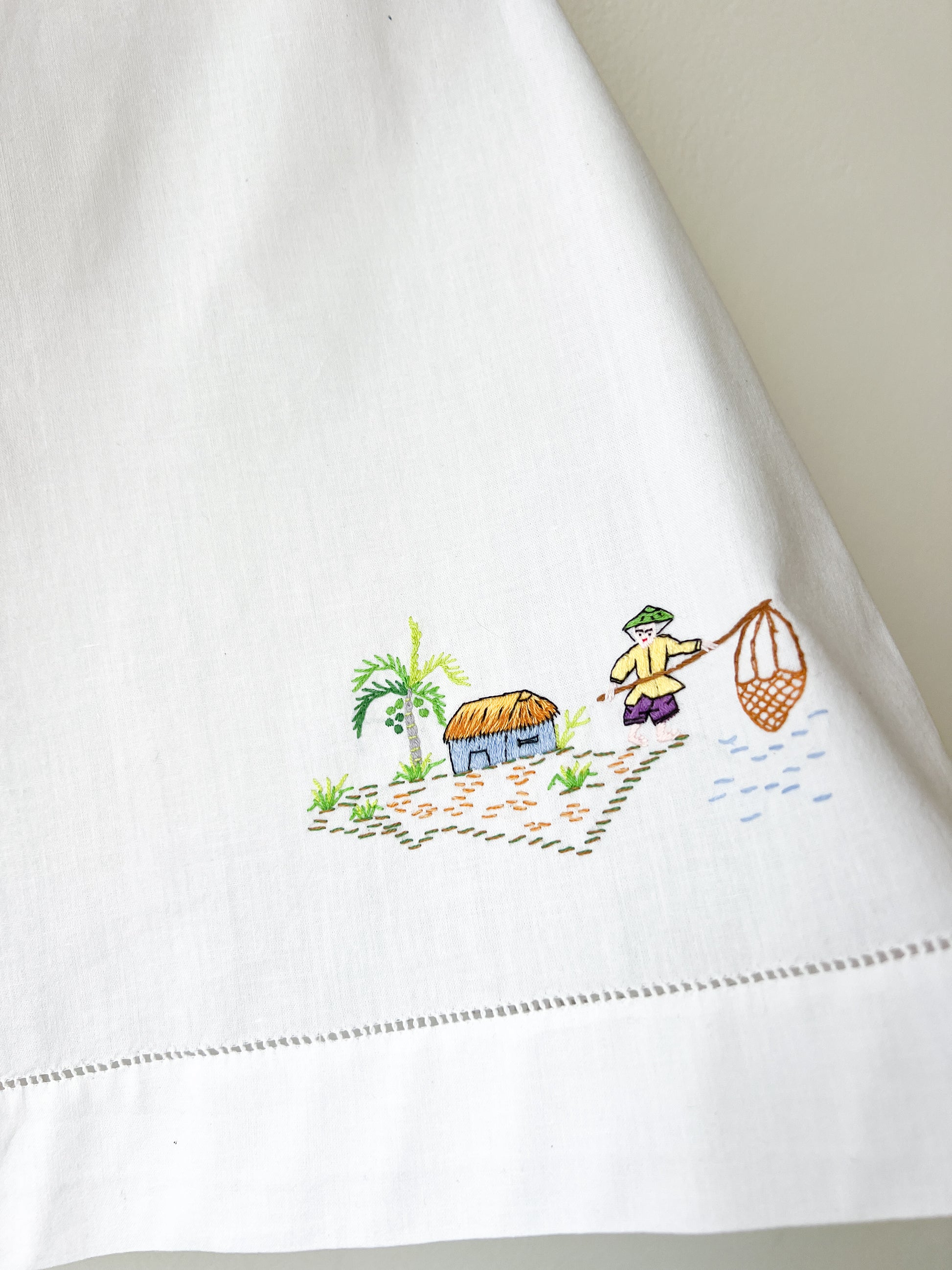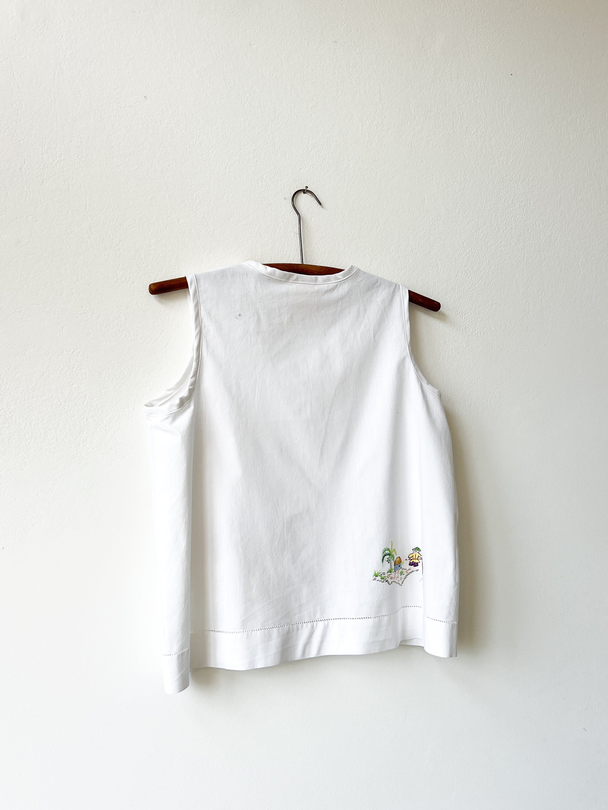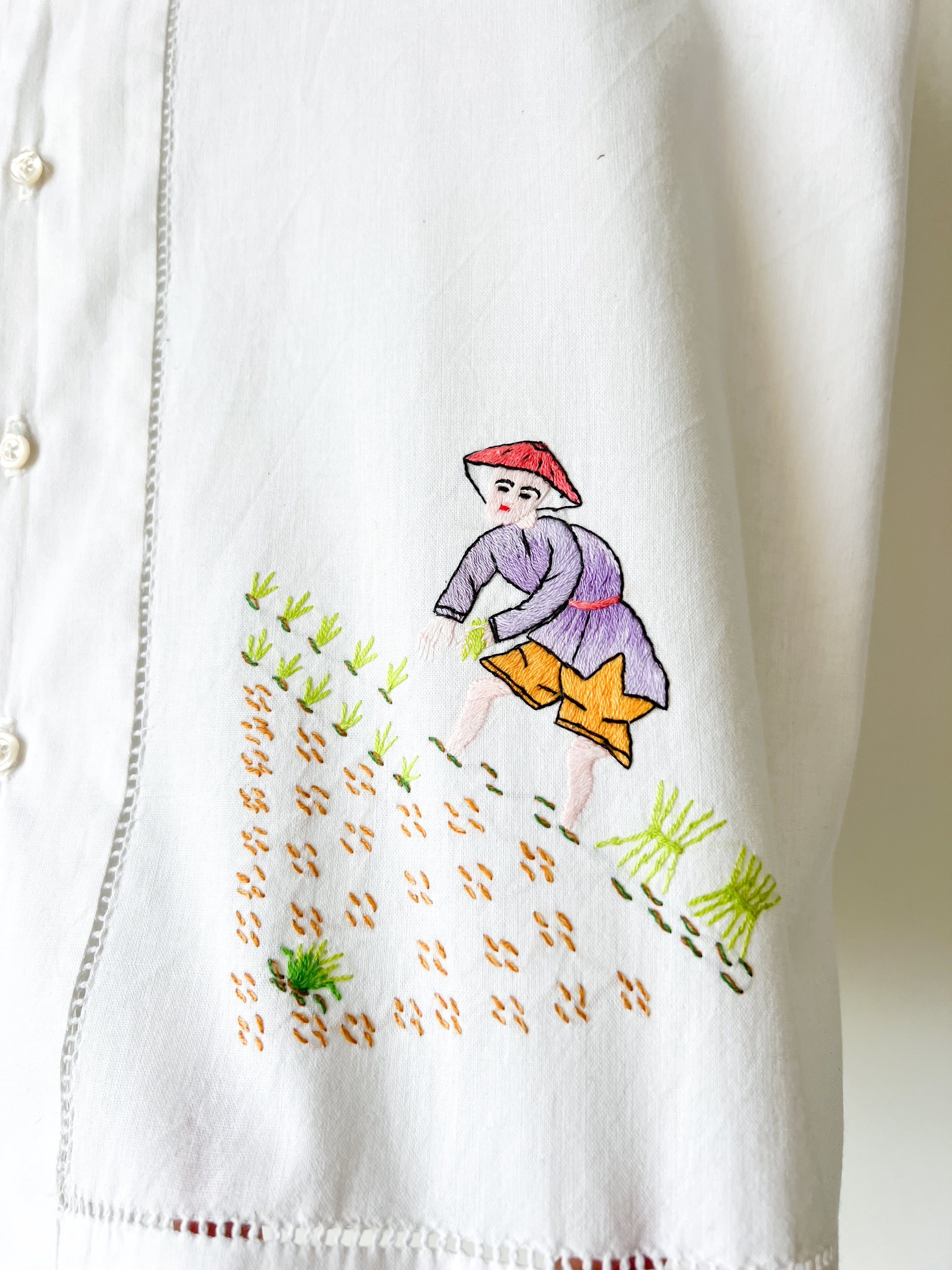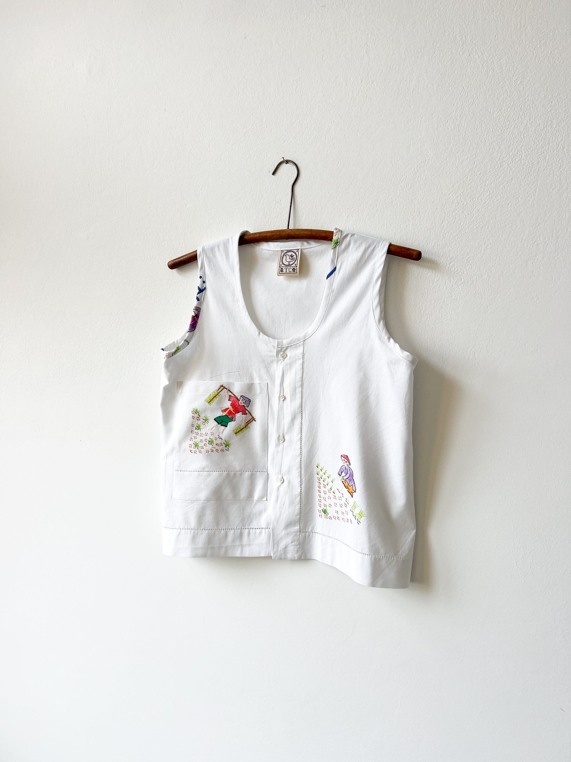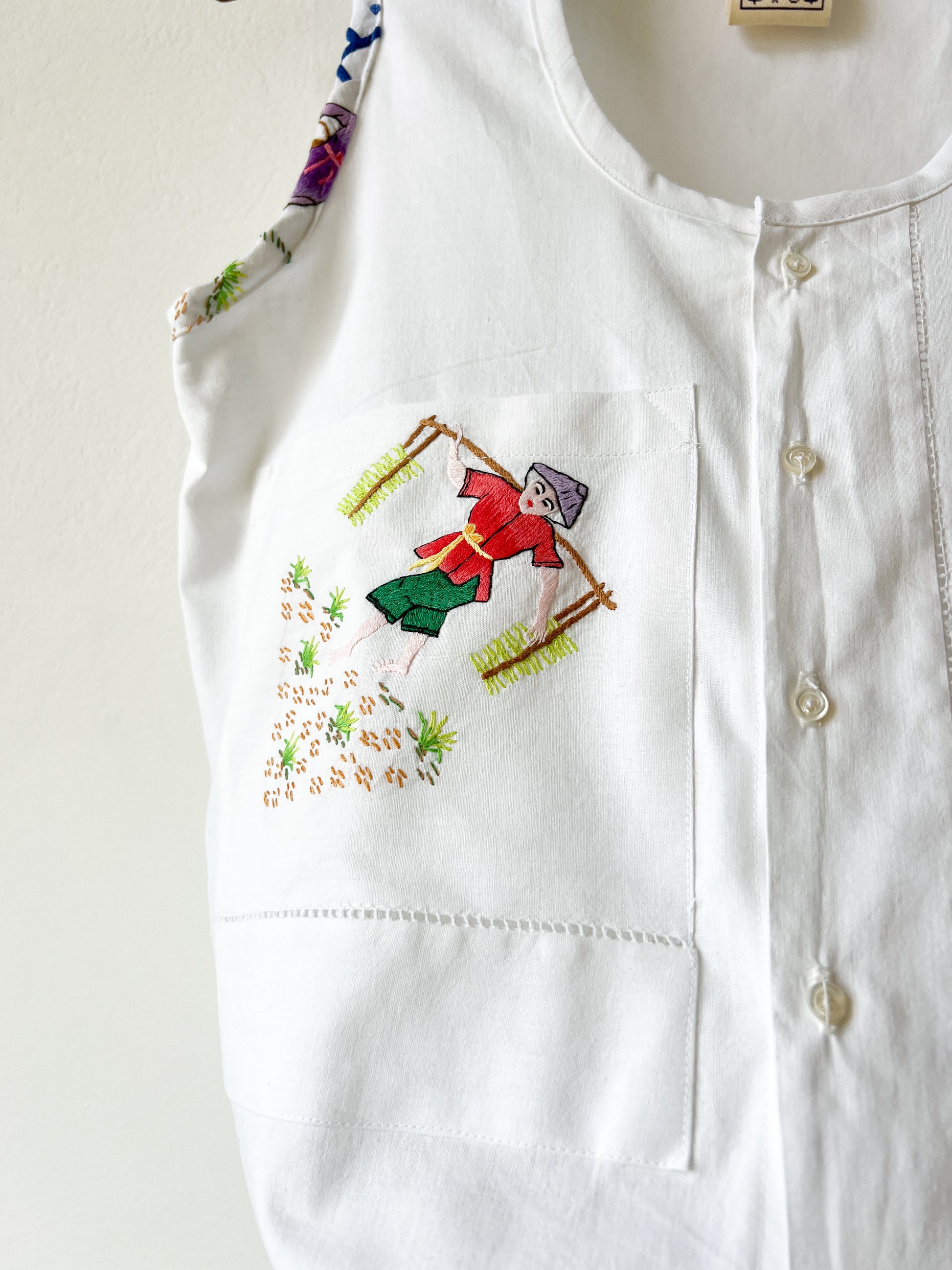 Košeľa bez rukávov ušitá zo starého vyšívaného obrusu. Vnútro aj vonkajšie lemy sú olemované šikmým prúžkom a celá košeľa je doplnená starými perleťovými gombíkmi.
