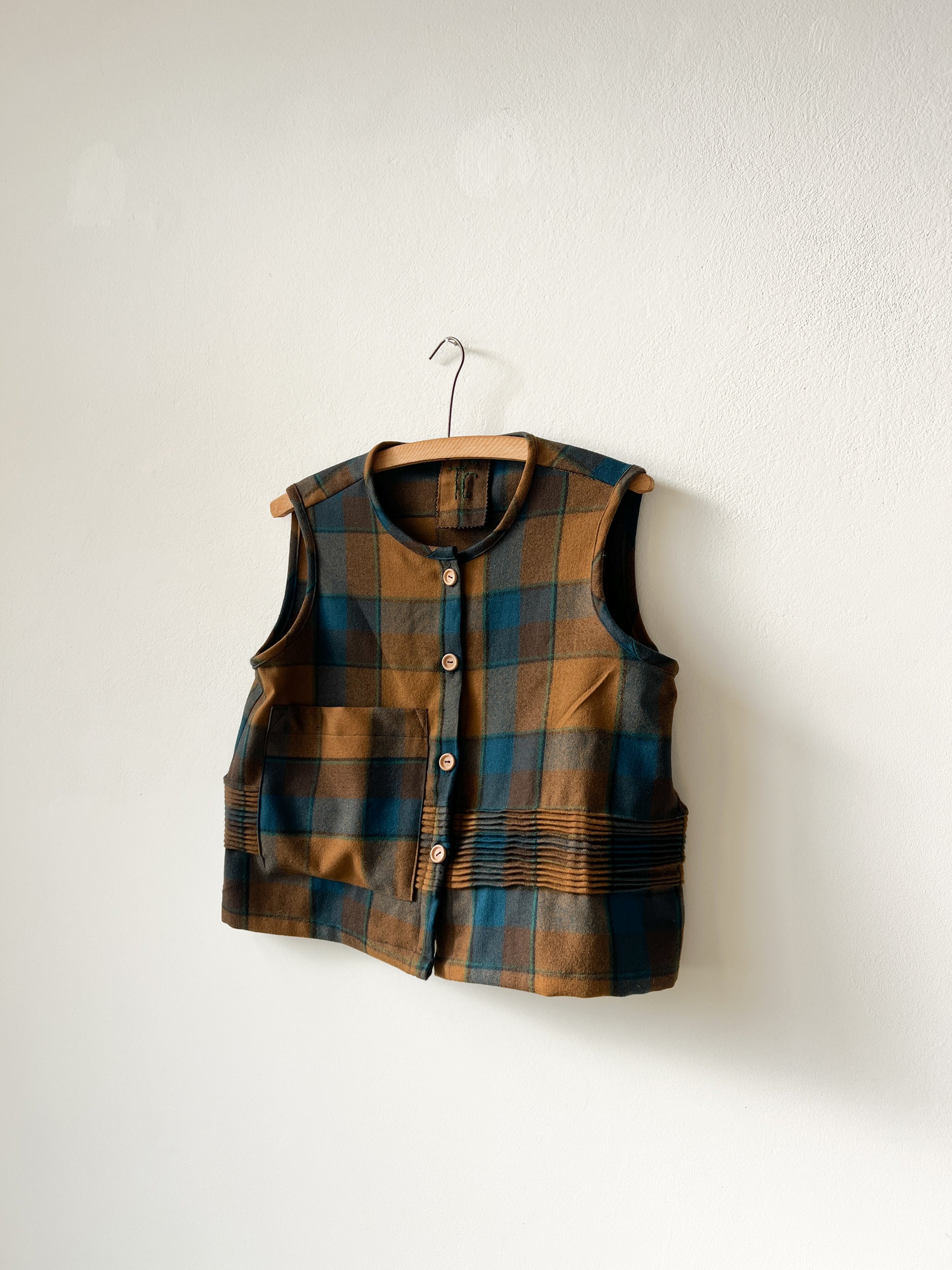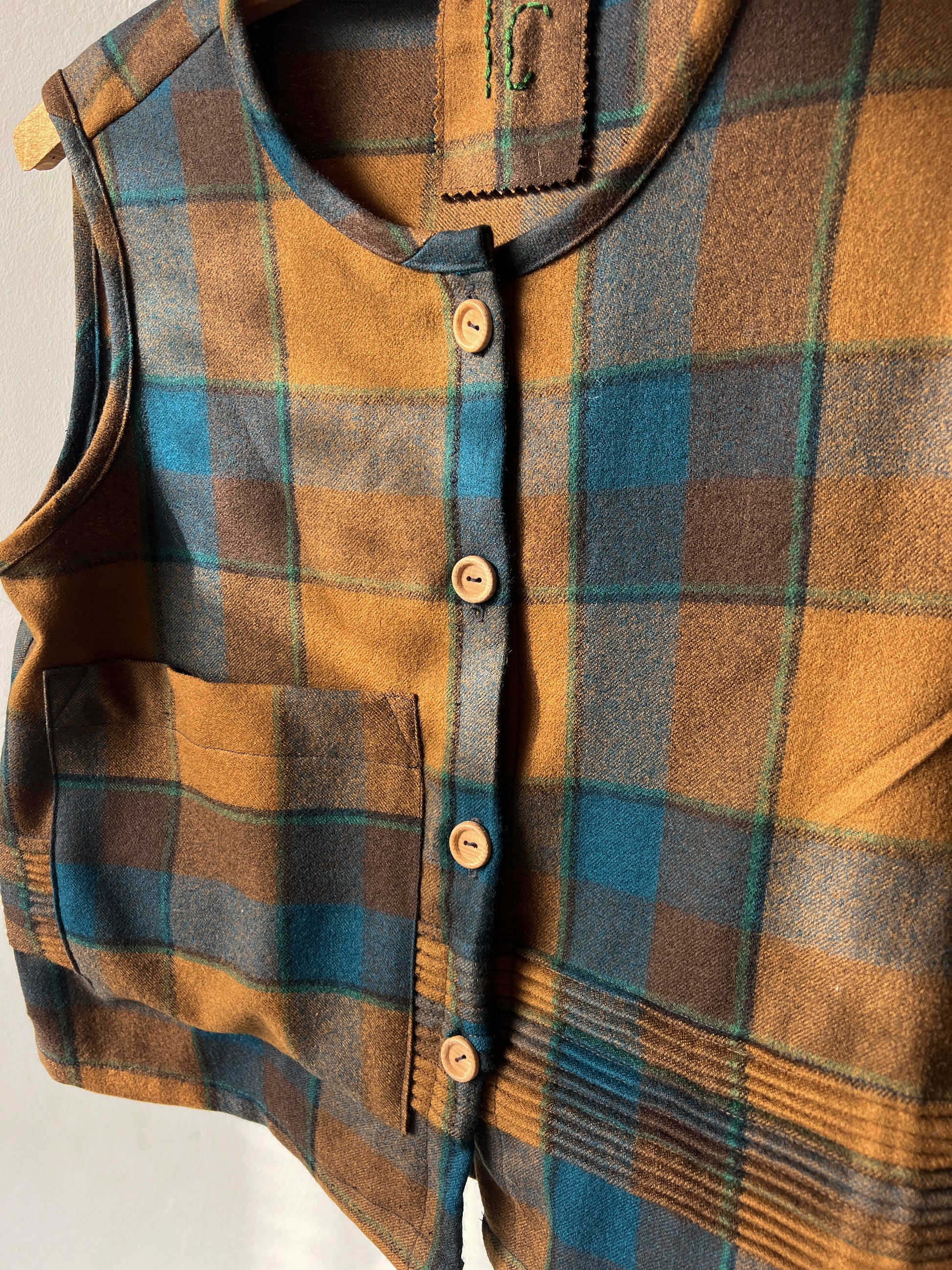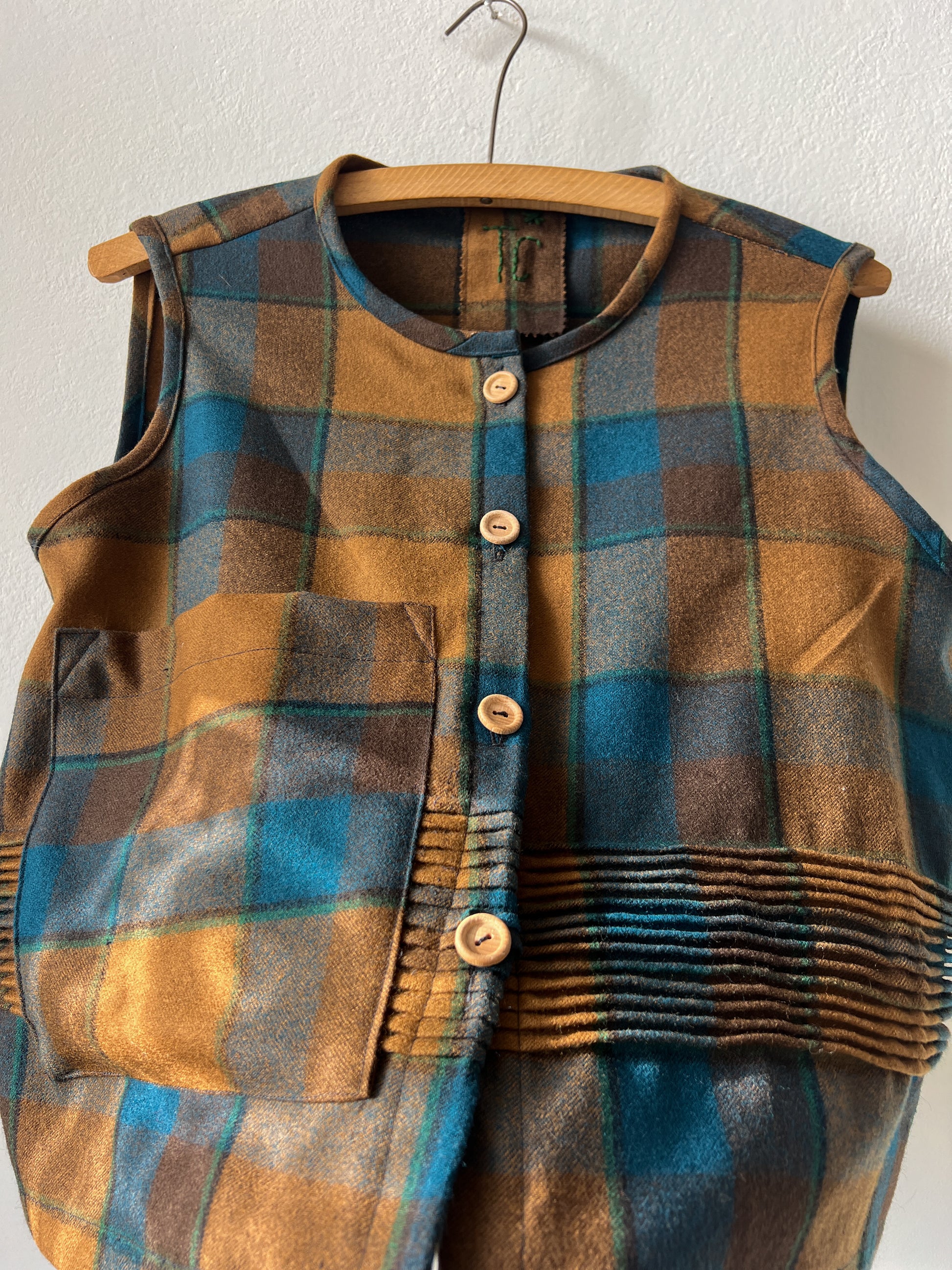 Vlnená vesta ušitá z vlnenej látky starého kroju. Na prednej aj zadnej strane má veľké vrecko, na spodku ponechané krojové naberianie a doplnená o staré gombíky.