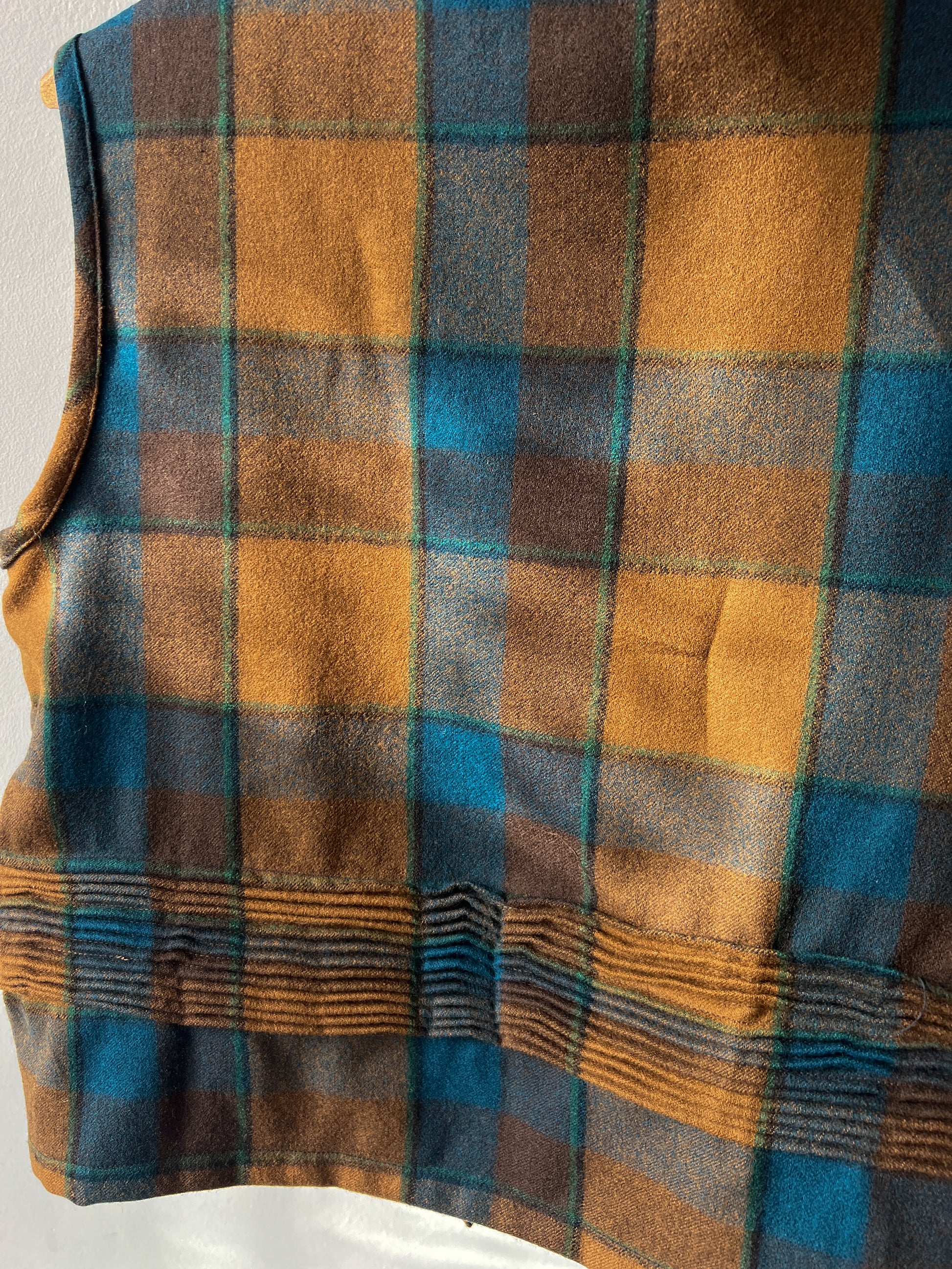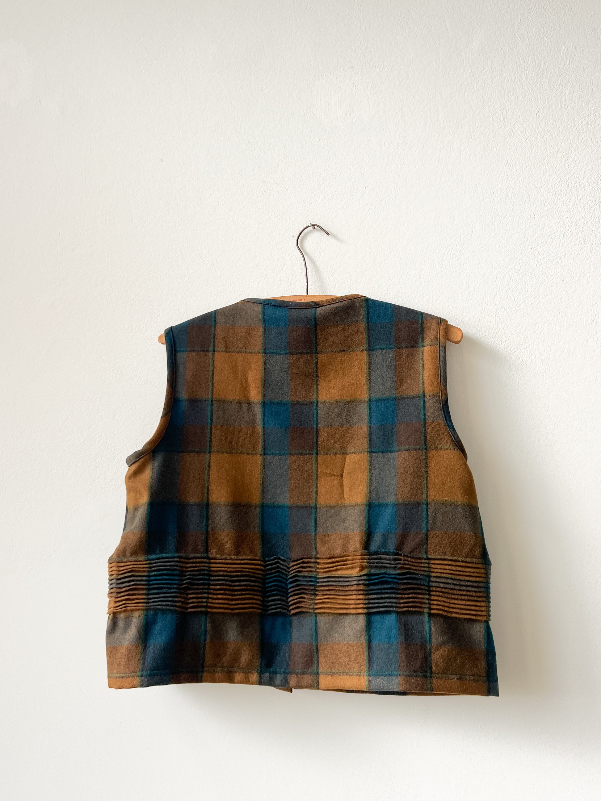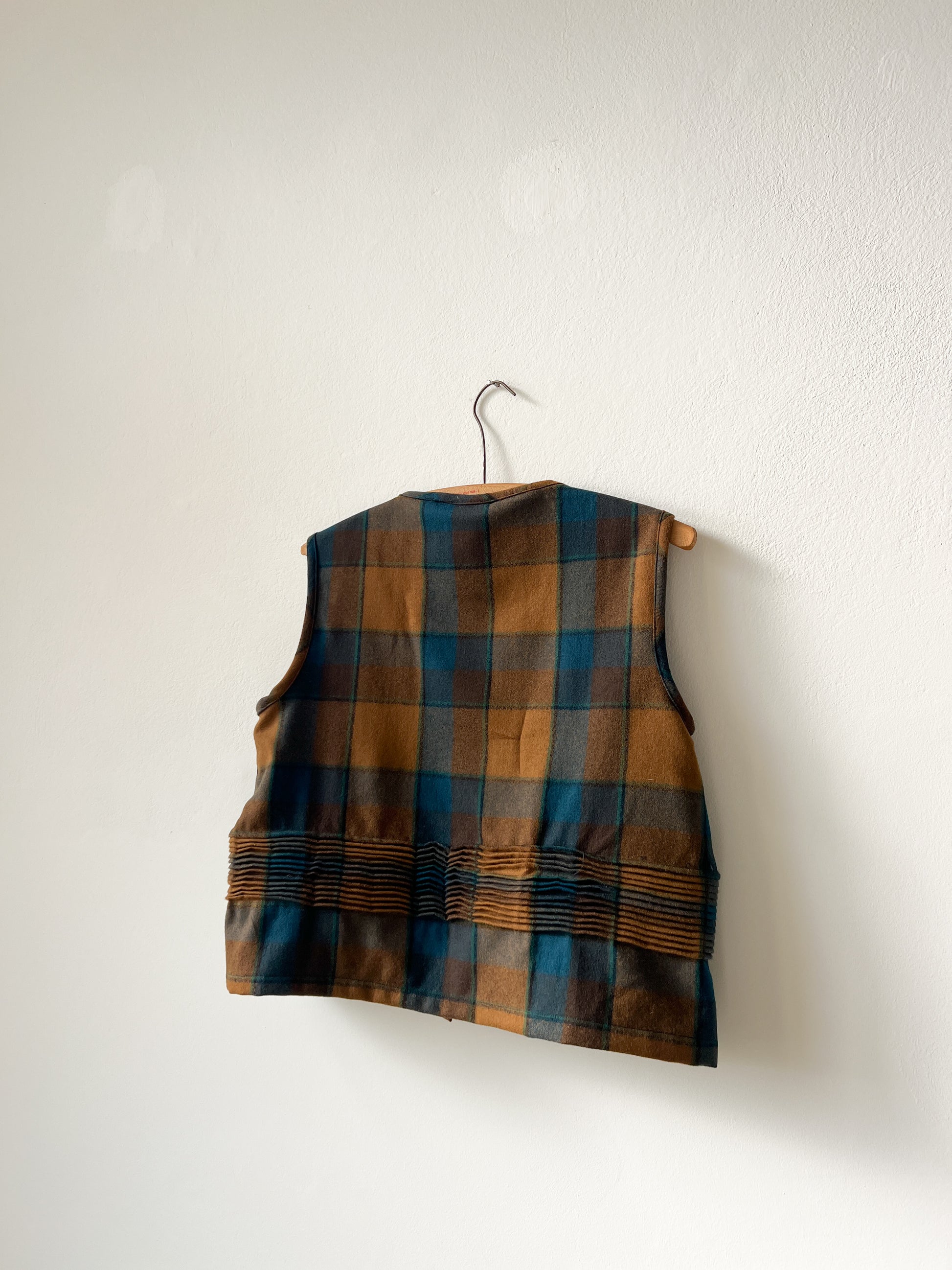 Vlnená vesta ušitá z vlnenej látky starého kroju. Na prednej aj zadnej strane má veľké vrecko, na spodku ponechané krojové naberianie a doplnená o staré gombíky.